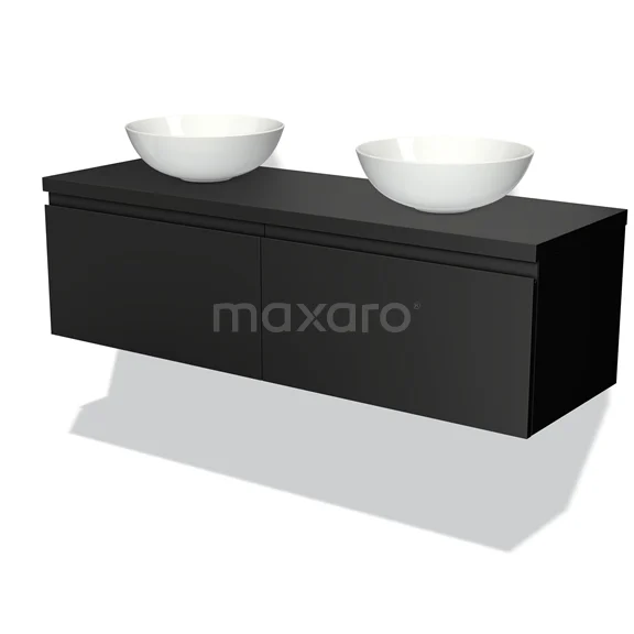 Modulo Plato Badmöbel mit Aufsatzwaschbecken | 140 cm Matt Schwarz Grifflos front Matt Schwarz blatt 2 nebeneinanderliegende Schubladen