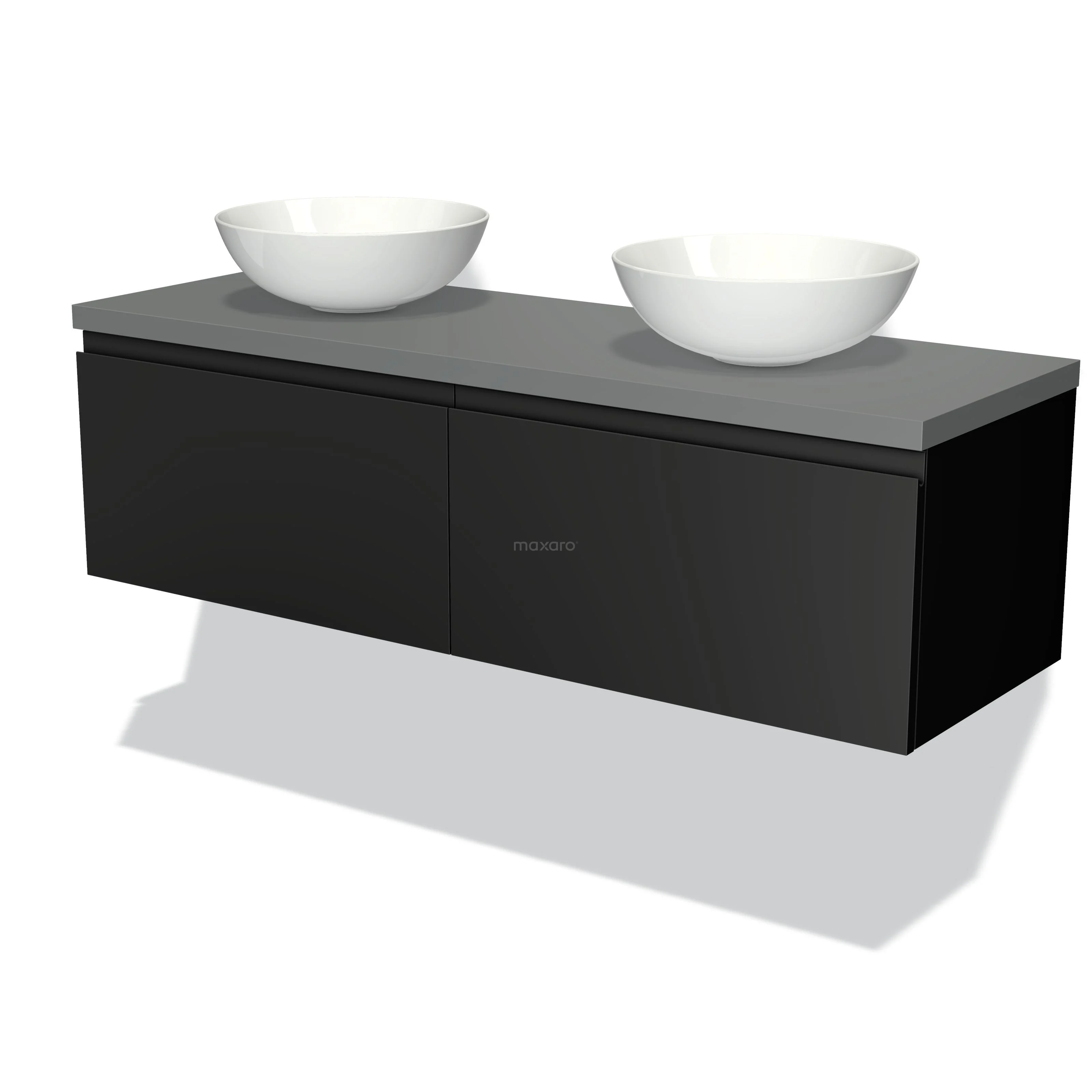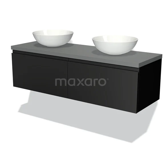 Modulo Plato Badmöbel mit Aufsatzwaschbecken | 140 cm Matt Schwarz Grifflos front Mittelgrau blatt 2 nebeneinanderliegende Schubladen