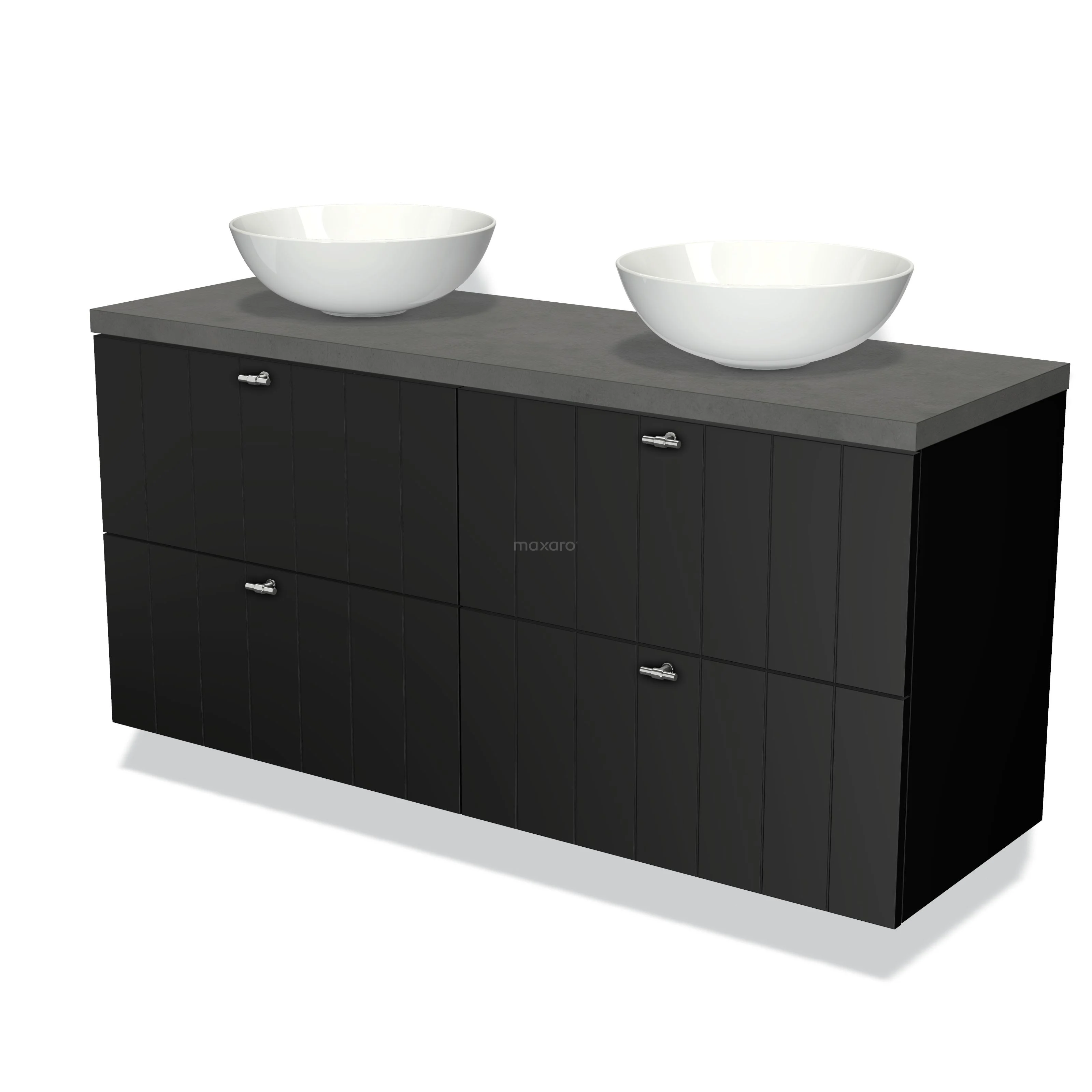 Modulo Plato Badmöbel mit Aufsatzwaschbecken | 140 cm Matt Schwarz Lamelle front Dunkelgrauer Beton blatt 4 Schubladen