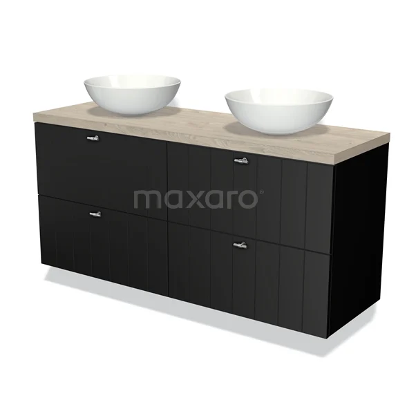 Modulo Plato Badmöbel mit Aufsatzwaschbecken | 140 cm Matt Schwarz Lamelle front Hellgraue Eiche blatt 4 Schubladen