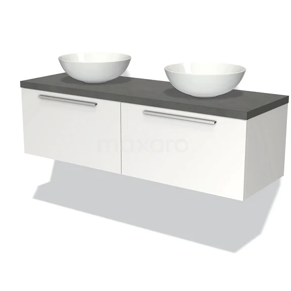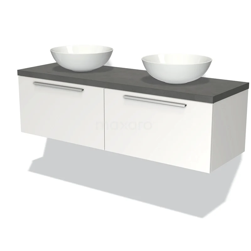 Modulo Plato Badmöbel mit Aufsatzwaschbecken | 140 cm Matt Weiß Flach front Dunkelgrauer Beton blatt 2 nebeneinanderliegende Schubladen