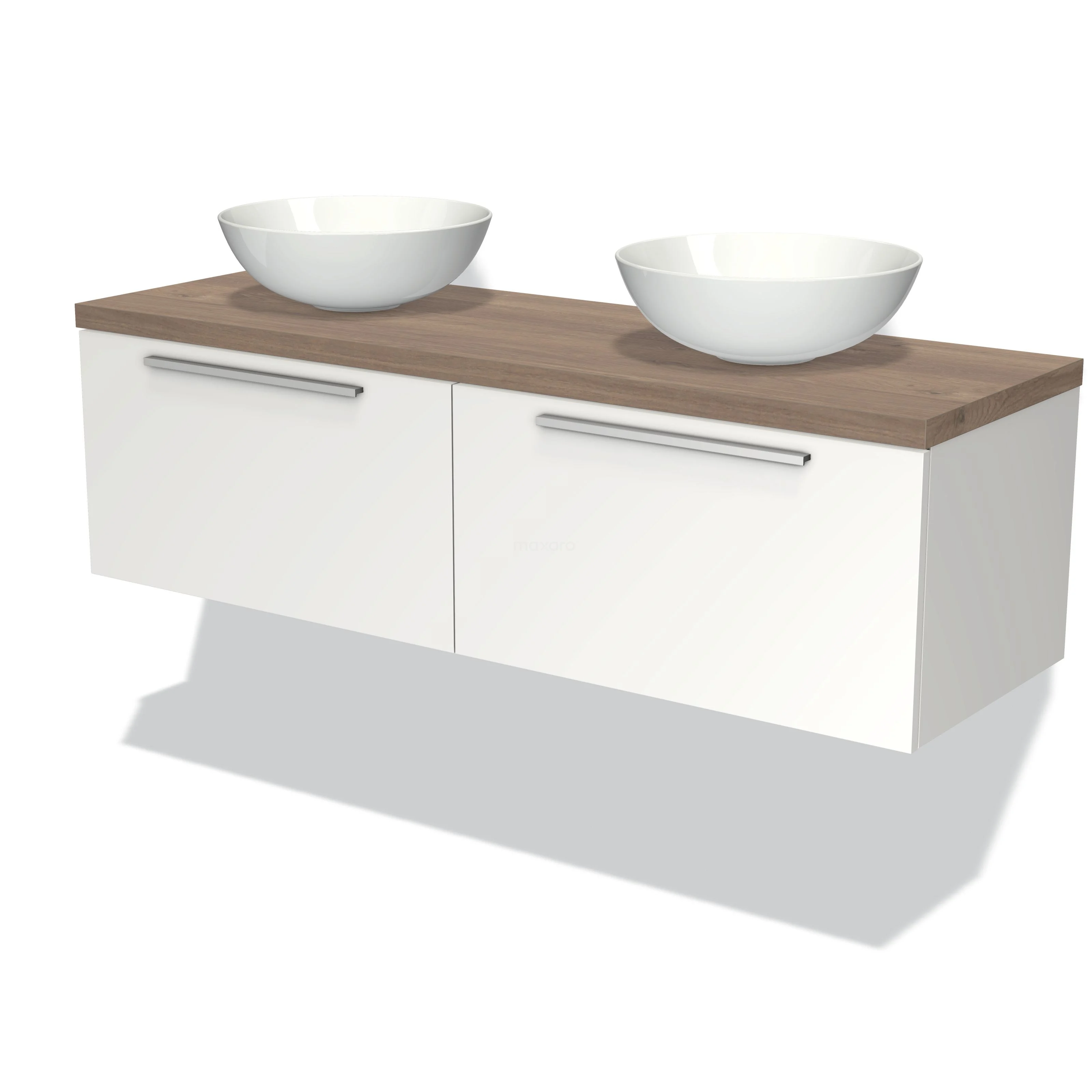 Modulo Plato Badmöbel mit Aufsatzwaschbecken | 140 cm Matt Weiß Flach front Mittelbraune Eiche blatt 2 nebeneinanderliegende Schubladen