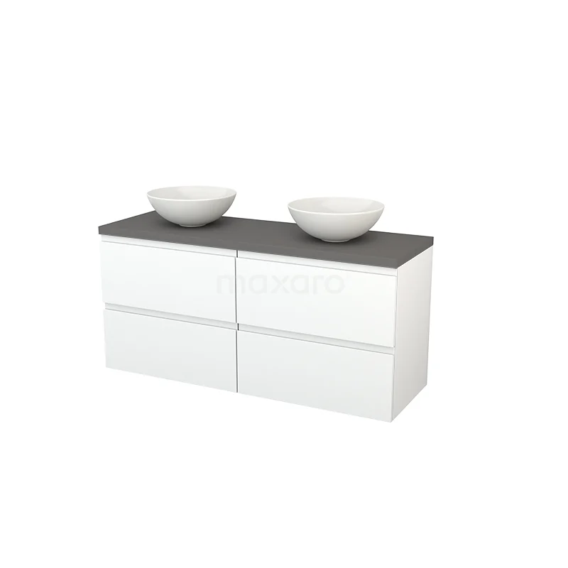 Modulo+ Plato Badmöbel mit Aufsatzwaschbecken | 140 cm Matt Weiß Grifflos front Basalt blatt 4 Schubladen