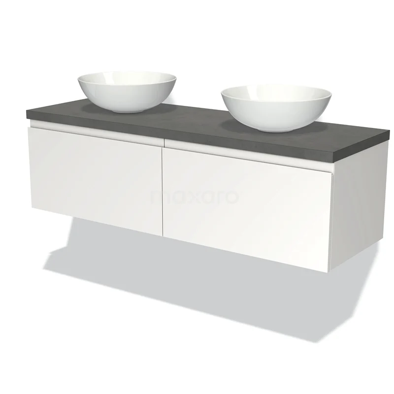 Modulo Plato Badmöbel mit Aufsatzwaschbecken | 140 cm Matt Weiß Grifflos front Dunkelgrauer Beton blatt 2 nebeneinanderliegende Schubladen