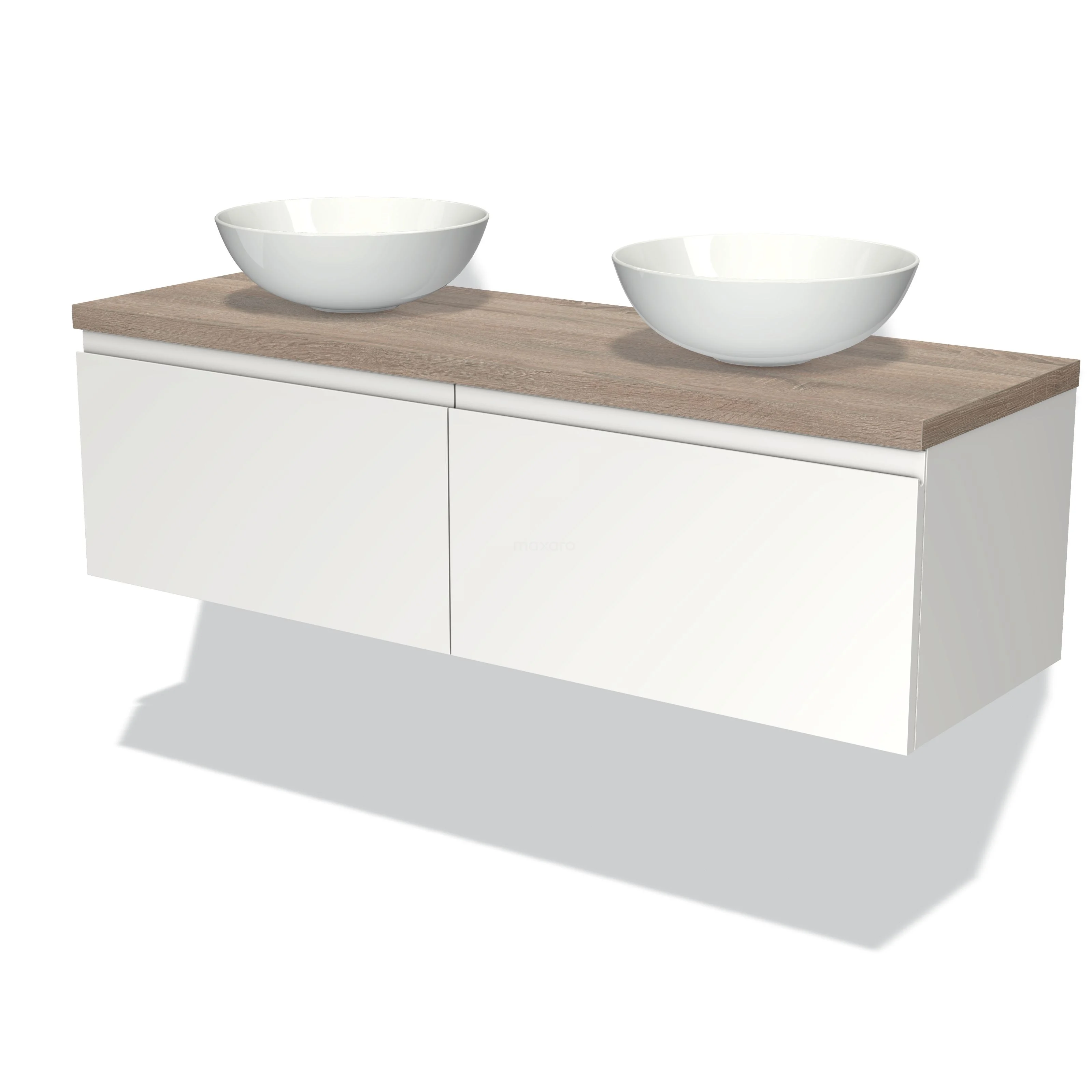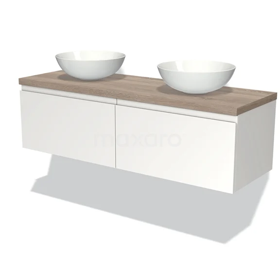 Modulo Plato Badmöbel mit Aufsatzwaschbecken | 140 cm Matt Weiß Grifflos front Eiche blatt 2 nebeneinanderliegende Schubladen