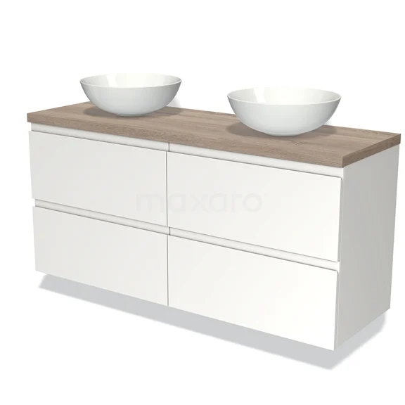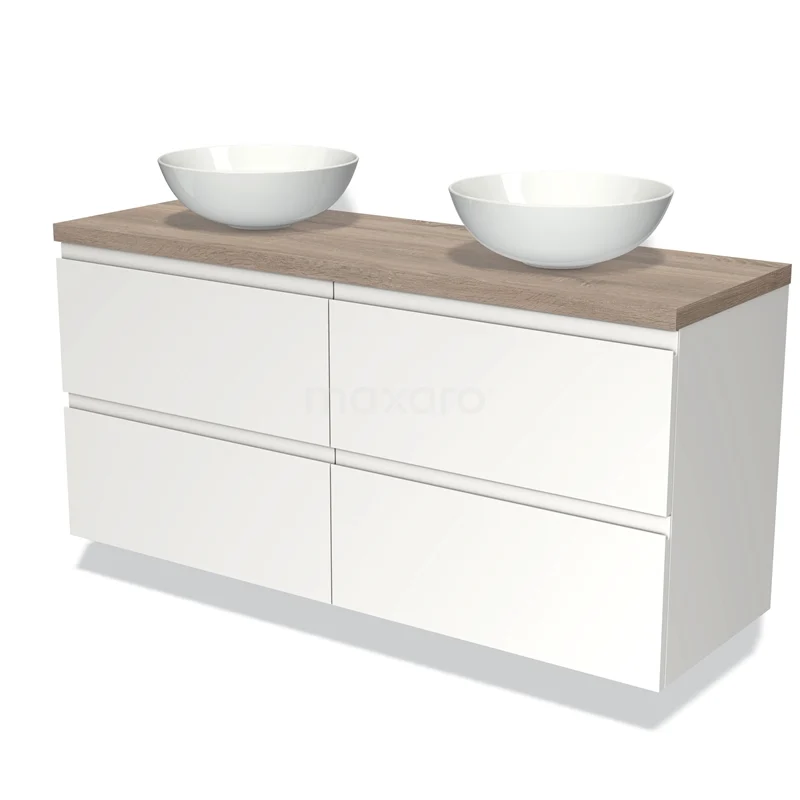 Modulo Plato Badmöbel mit Aufsatzwaschbecken | 140 cm Matt Weiß Grifflos front Eiche blatt 4 Schubladen