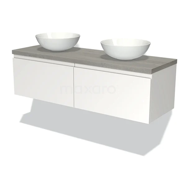 Modulo Plato Badmöbel mit Aufsatzwaschbecken | 140 cm Matt Weiß Grifflos front Graue Eiche blatt 2 nebeneinanderliegende Schubladen