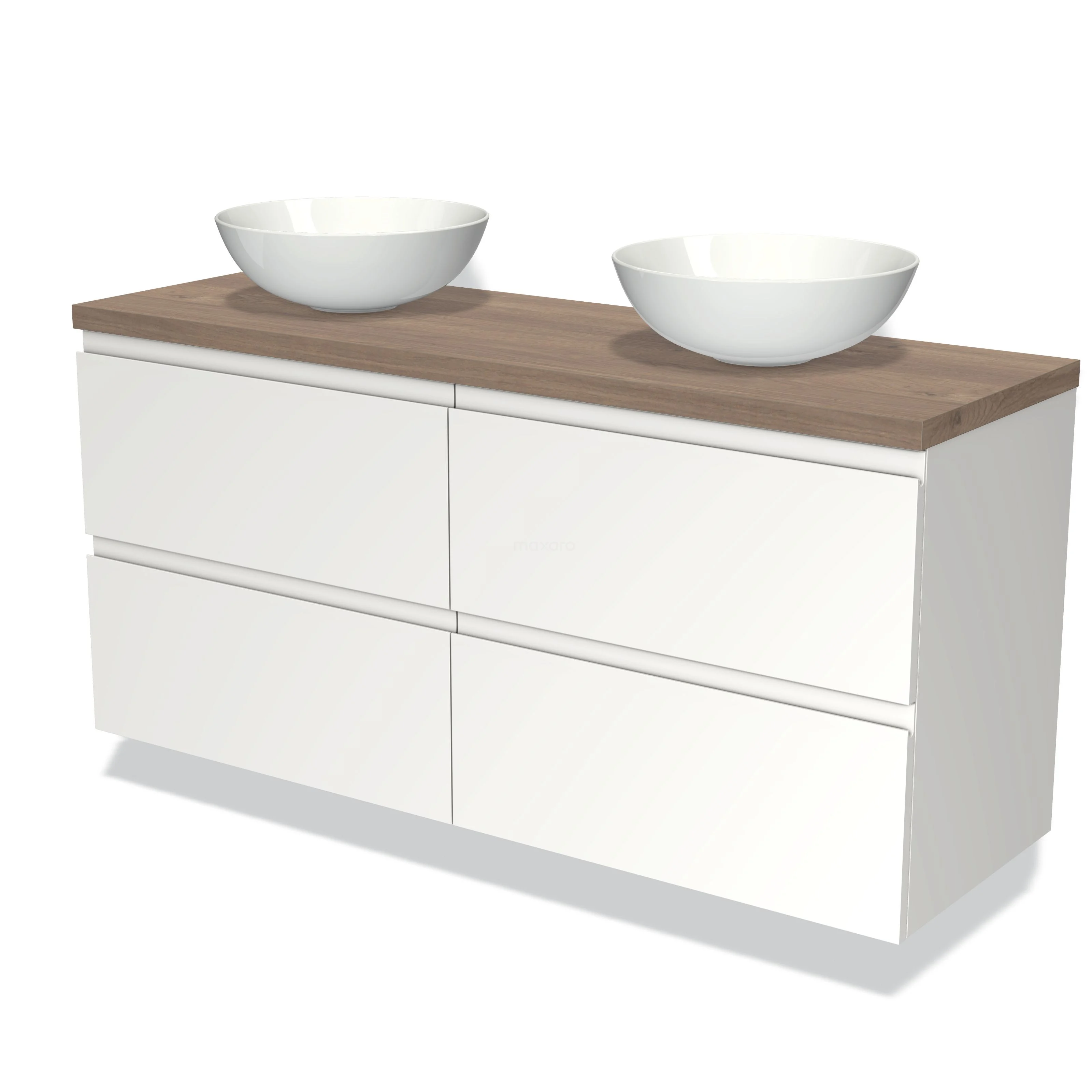 Modulo Plato Badmöbel mit Aufsatzwaschbecken | 140 cm Matt Weiß Grifflos front Mittelbraune Eiche blatt 4 Schubladen