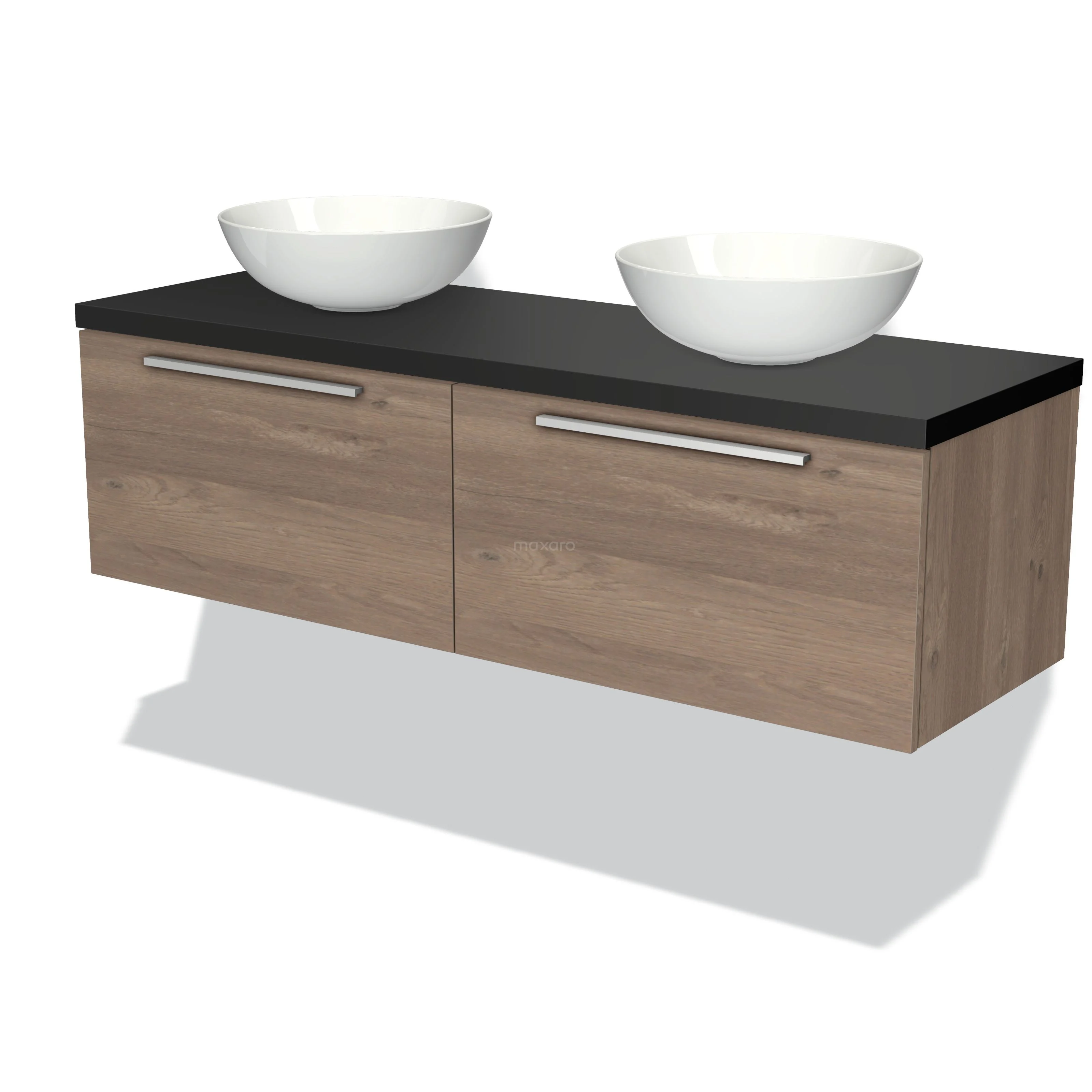 Modulo Plato Badmöbel mit Aufsatzwaschbecken | 140 cm Mittelbraune Eiche Flach front Matt Schwarz blatt 2 nebeneinanderliegende Schubladen