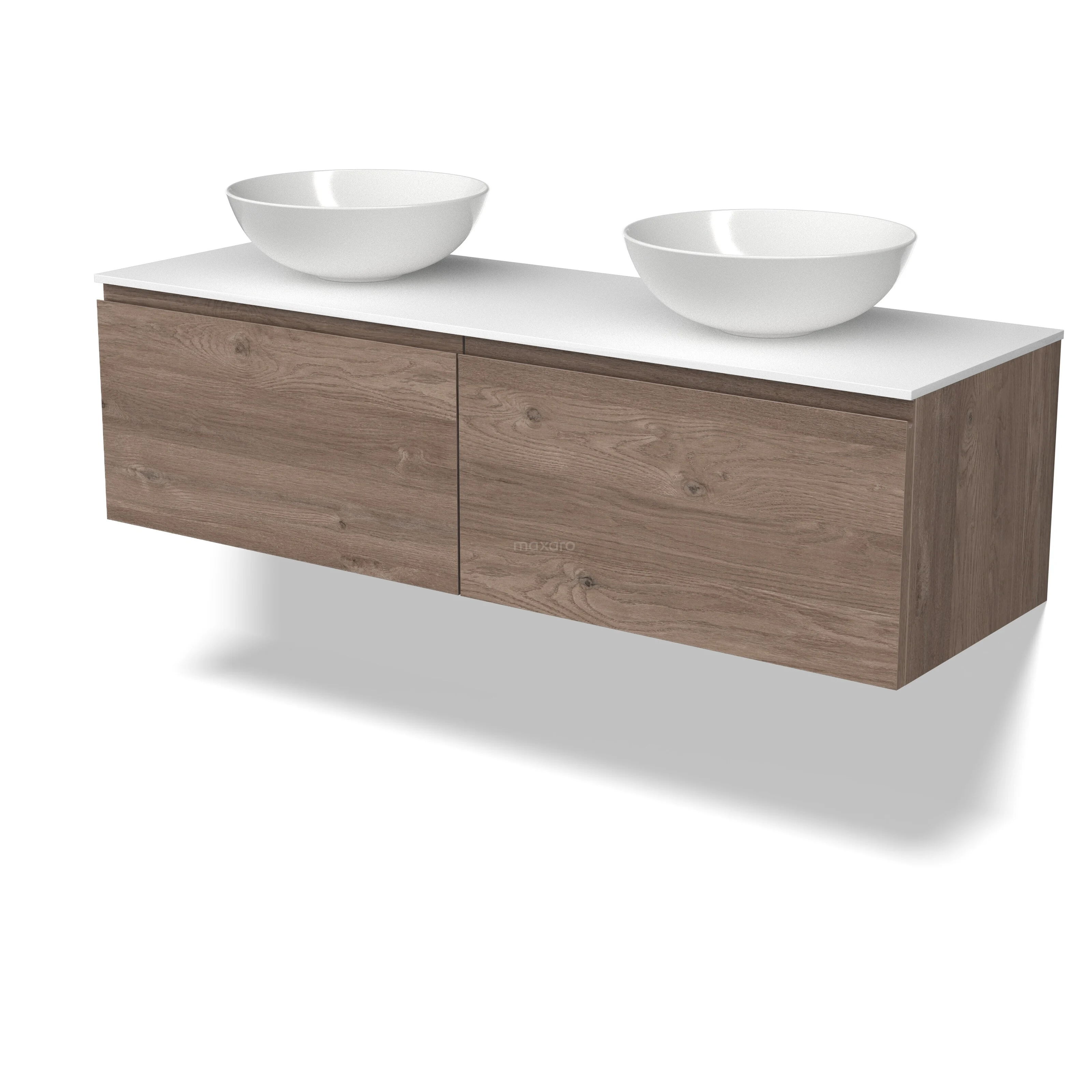 Modulo Plato Badmöbel mit Aufsatzwaschbecken | 140 cm Mittelbraune Eiche Grifflos front Solid Surface blatt 2 nebeneinanderliegende Schubladen