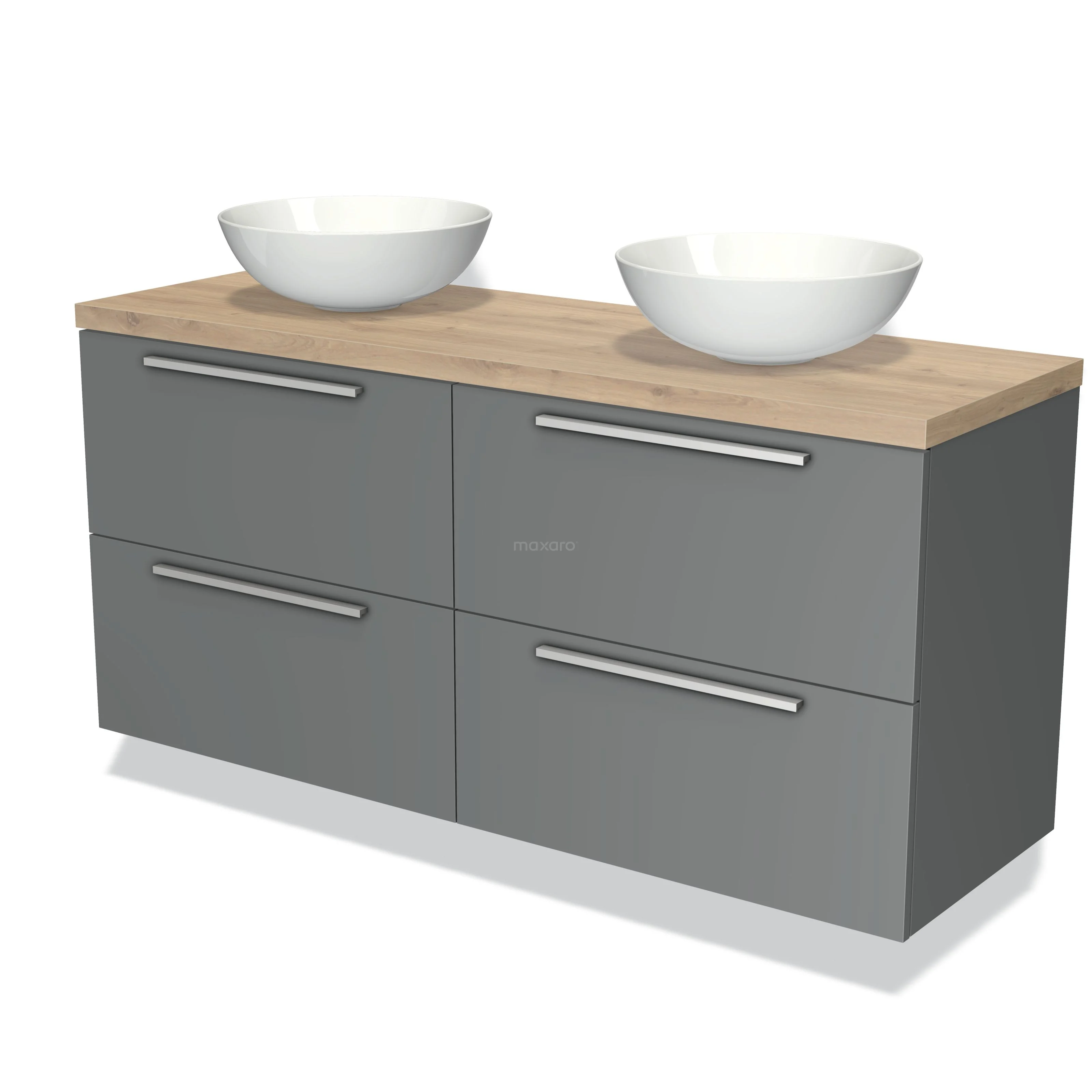 Modulo Plato Badmöbel mit Aufsatzwaschbecken | 140 cm Mittelgrau Flach front Hellbraune Eiche blatt 4 Schubladen