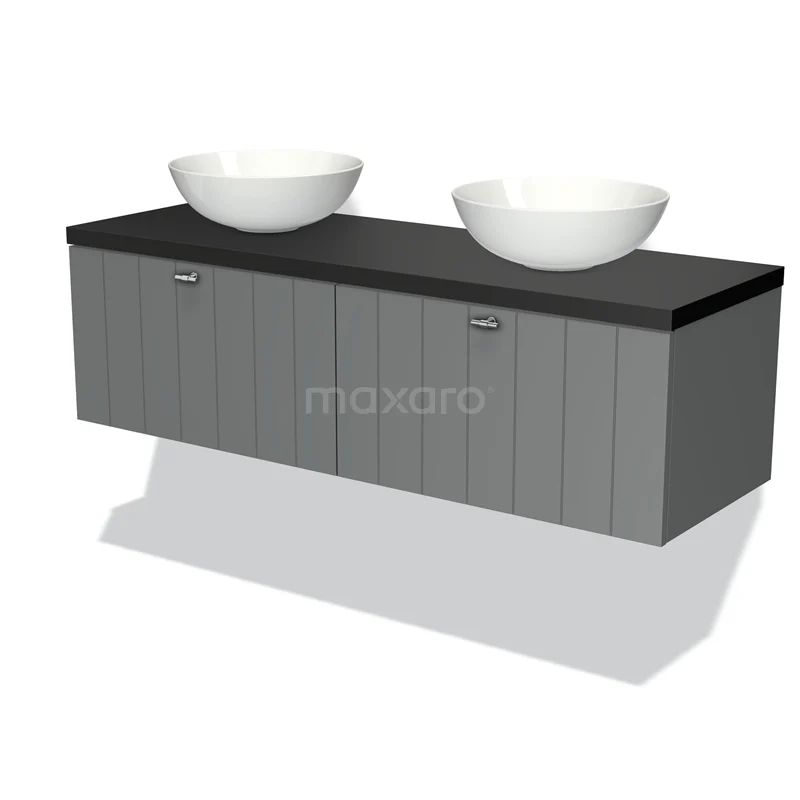 Modulo Plato Badmöbel mit Aufsatzwaschbecken | 140 cm Mittelgrau Lamelle front Matt Schwarz blatt 2 nebeneinanderliegende Schubladen