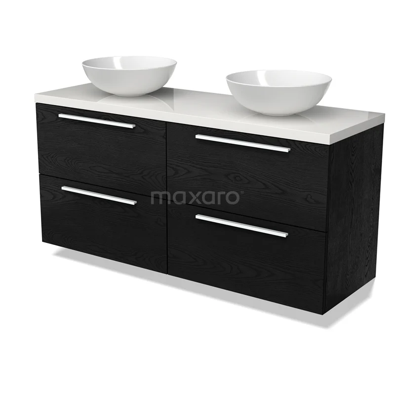 Modulo Plato Badmöbel mit Aufsatzwaschbecken | 140 cm Schwarze Eiche Flach front Hochglanz Weiß blatt 4 Schubladen