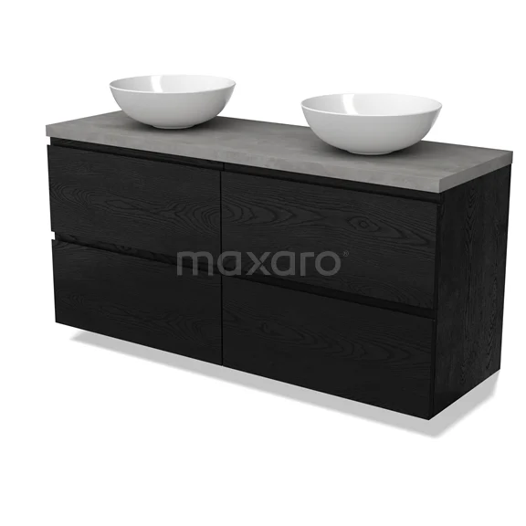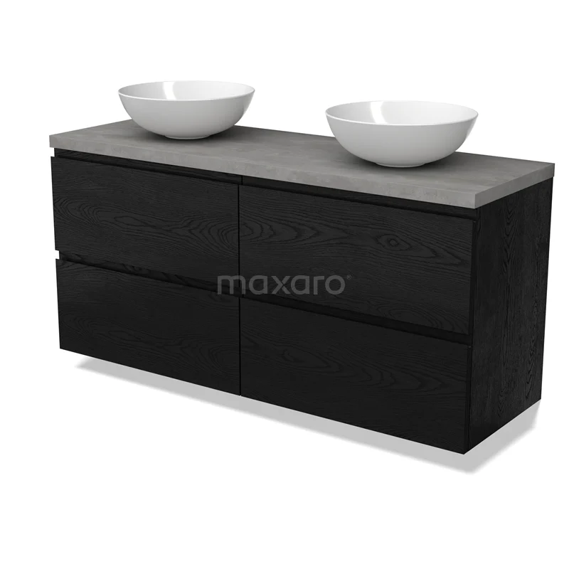 Modulo Plato Badmöbel mit Aufsatzwaschbecken | 140 cm Schwarze Eiche Grifflos front Hellgrauer Beton blatt 4 Schubladen