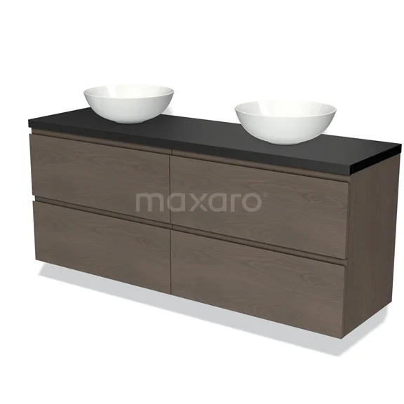 Modulo Plato Badmöbel mit Aufsatzwaschbecken | 160 cm Dunkelbraune Eiche Grifflos front Matt Schwarz blatt 4 Schubladen