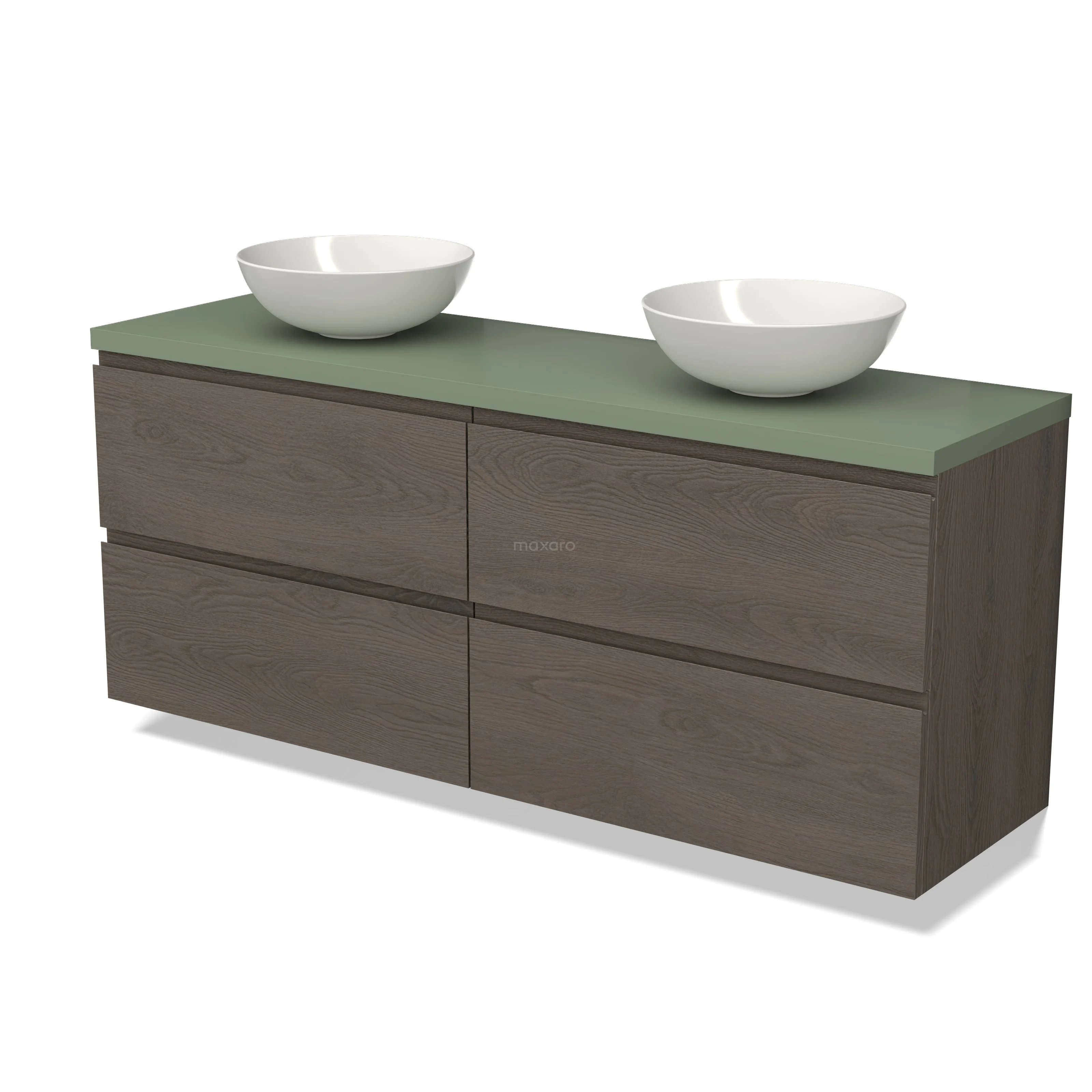 Modulo Plato Badmöbel mit Aufsatzwaschbecken | 160 cm Dunkelbraune Eiche Grifflos front Salbeigrün blatt 4 Schubladen