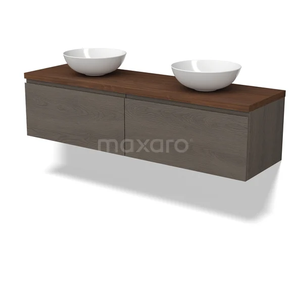 Modulo Plato Badmöbel mit Aufsatzwaschbecken | 160 cm Dunkelbraune Eiche Grifflos front Walnuss blatt 2 nebeneinanderliegende Schubladen