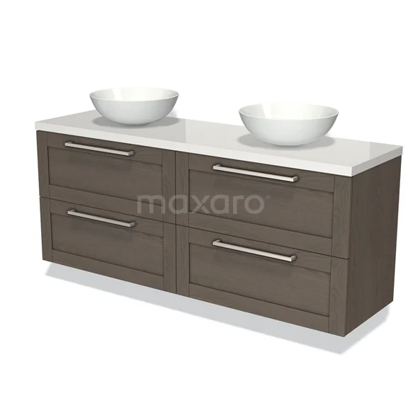 Modulo Plato Badmöbel mit Aufsatzwaschbecken | 160 cm Dunkelbraune Eiche Rahmen front Hochglanz Weiß blatt 4 Schubladen