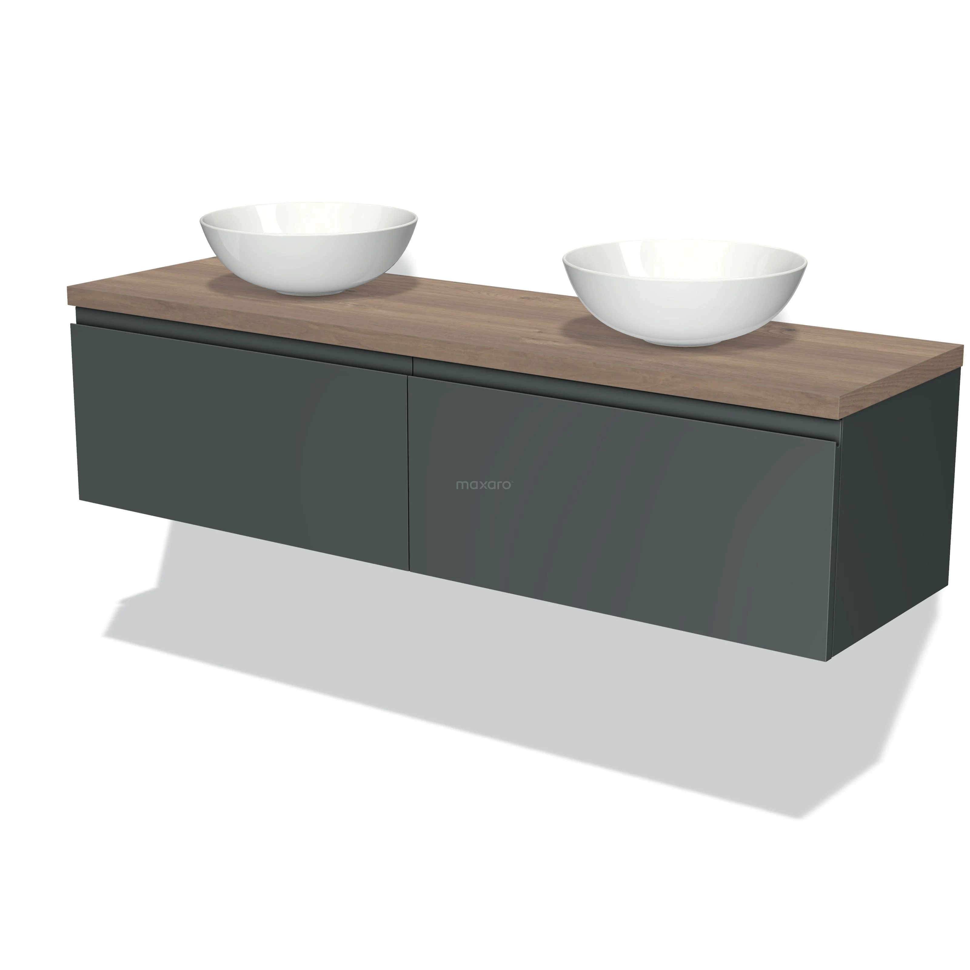 Modulo Plato Badmöbel mit Aufsatzwaschbecken | 160 cm Dunkelgrau Grifflos front Mittelbraune Eiche blatt 2 nebeneinanderliegende Schubladen