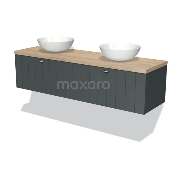 Modulo Plato Badmöbel mit Aufsatzwaschbecken | 160 cm Dunkelgrau Lamelle front Hellbraune Eiche blatt 2 nebeneinanderliegende Schubladen
