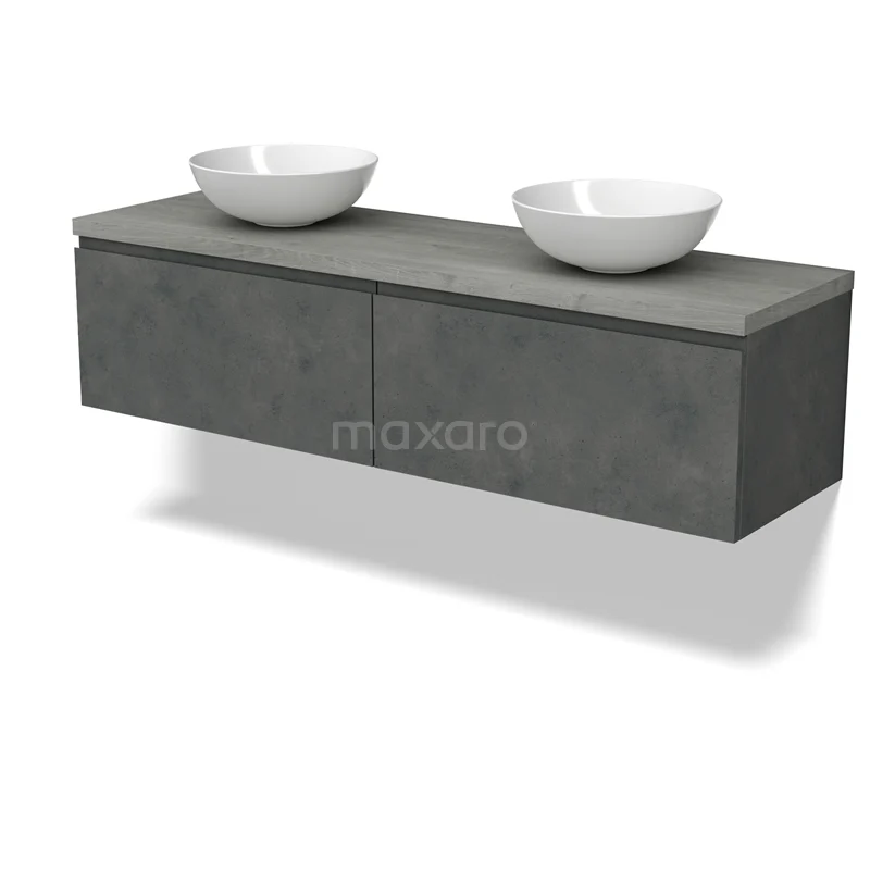 Modulo Plato Badmöbel mit Aufsatzwaschbecken | 160 cm Dunkelgrauer Beton Grifflos front Graue Eiche blatt 2 nebeneinanderliegende Schubladen