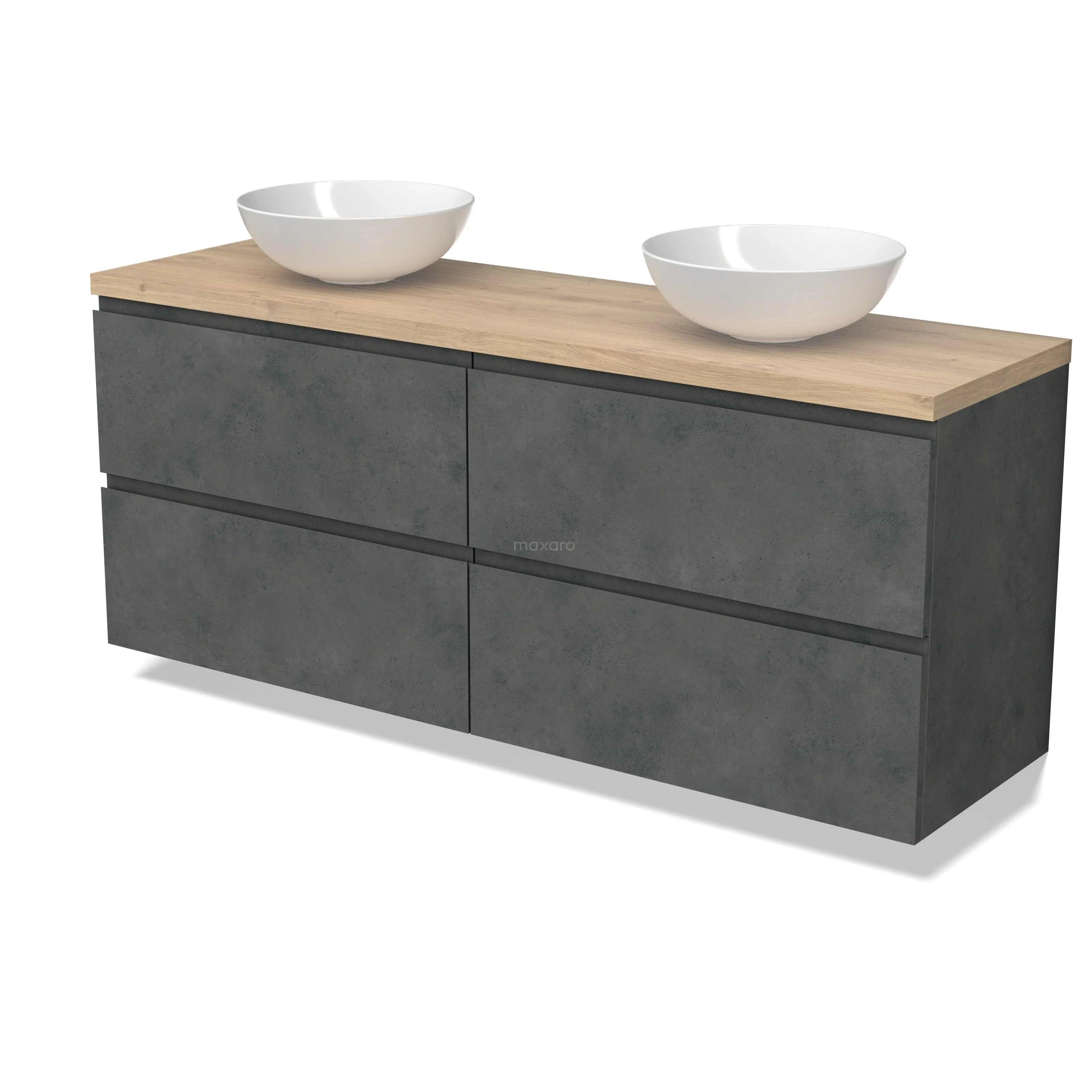 Modulo Plato Badmöbel mit Aufsatzwaschbecken | 160 cm Dunkelgrauer Beton Grifflos front Hellbraune Eiche blatt 4 Schubladen