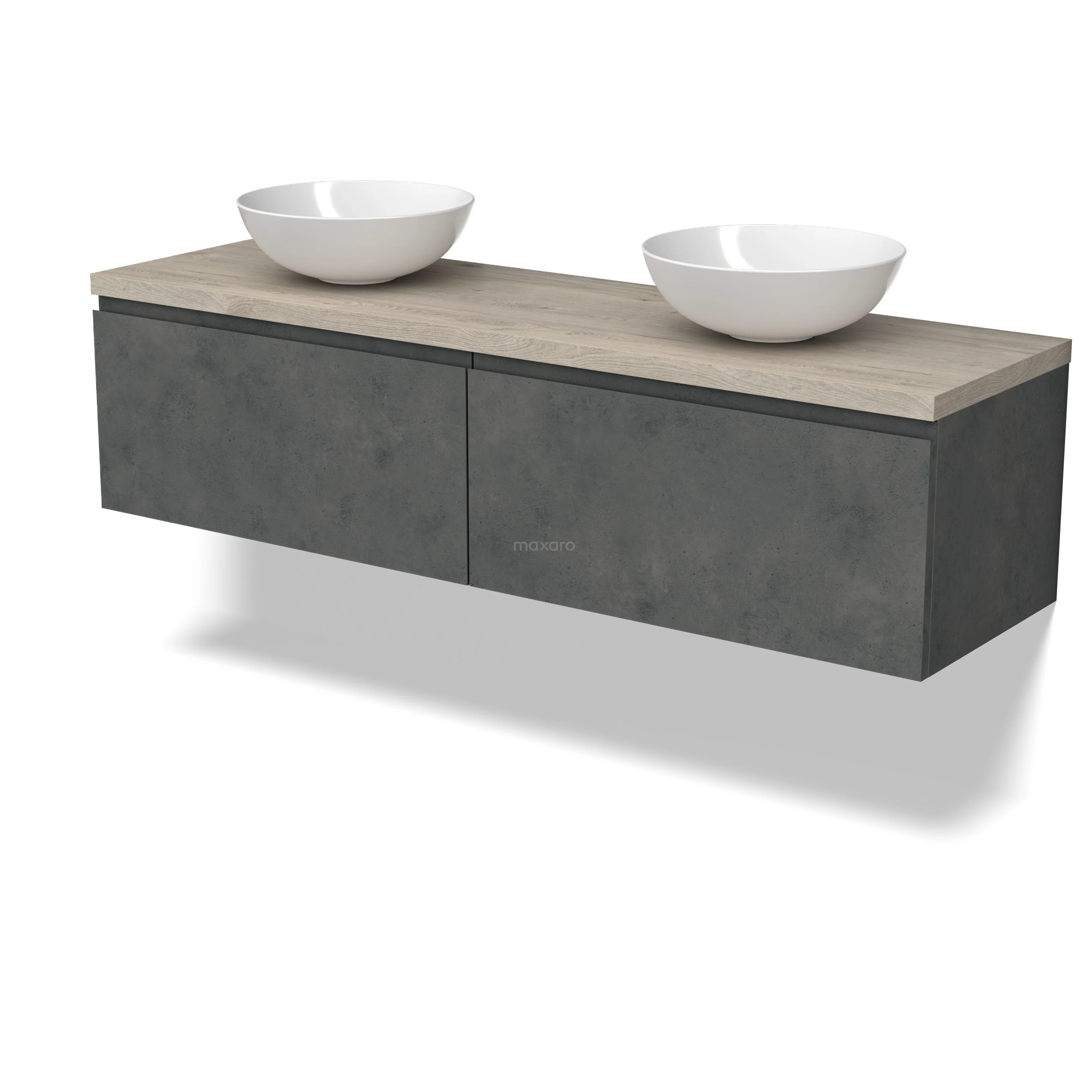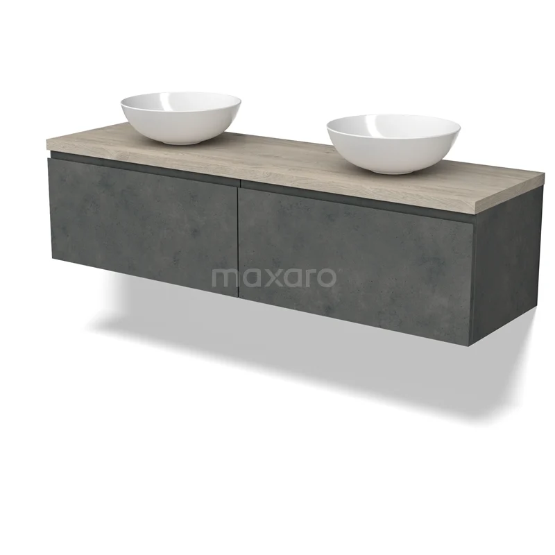 Modulo Plato Badmöbel mit Aufsatzwaschbecken | 160 cm Dunkelgrauer Beton Grifflos front Hellgraue Eiche blatt 2 nebeneinanderliegende Schubladen