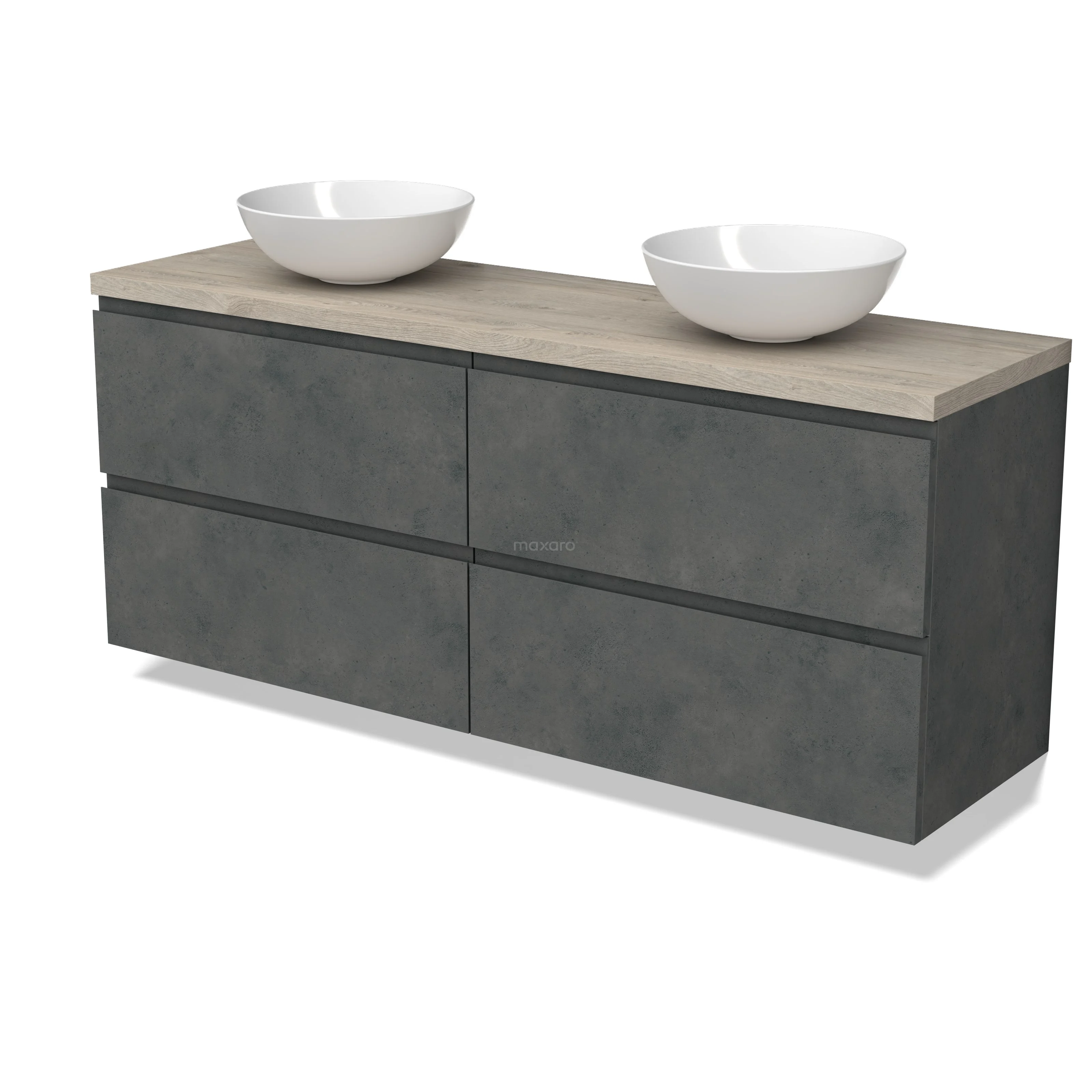 Modulo Plato Badmöbel mit Aufsatzwaschbecken | 160 cm Dunkelgrauer Beton Grifflos front Hellgraue Eiche blatt 4 Schubladen