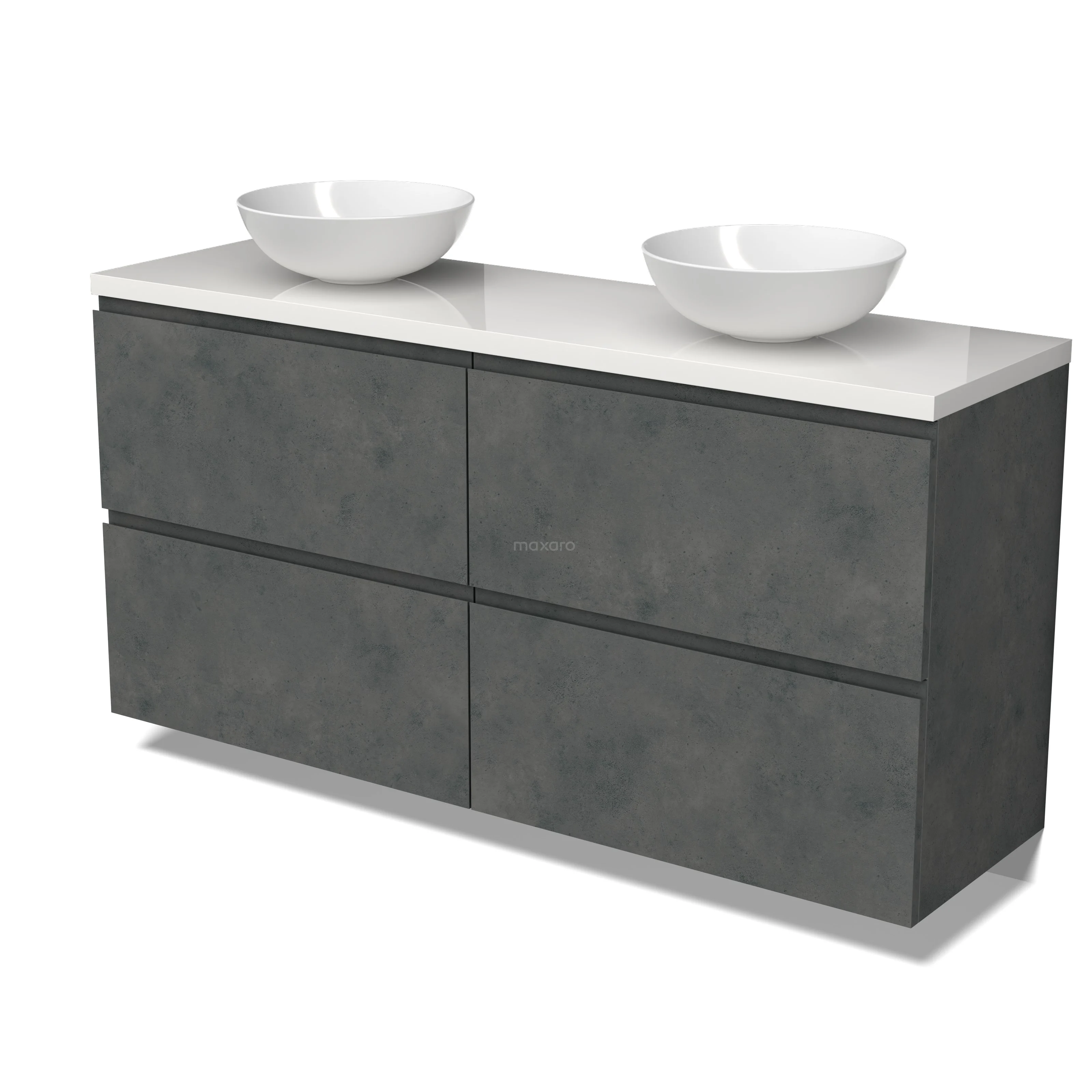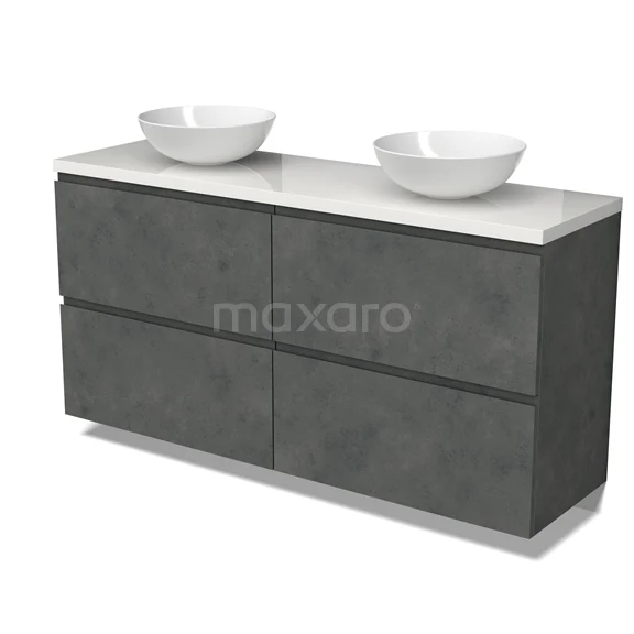 Modulo Plato Badmöbel mit Aufsatzwaschbecken | 160 cm Dunkelgrauer Beton Grifflos front Hochglanz Weiß blatt 4 hohe Schubladen