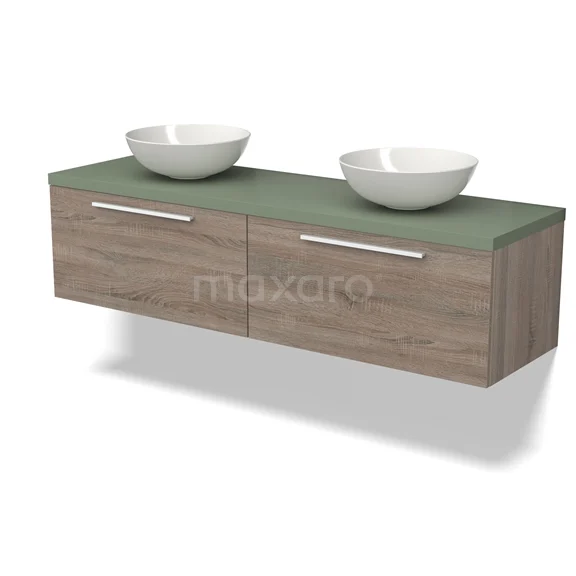 Modulo Plato Badmöbel mit Aufsatzwaschbecken | 160 cm Eiche Flach front Salbeigrün blatt 2 nebeneinanderliegende Schubladen