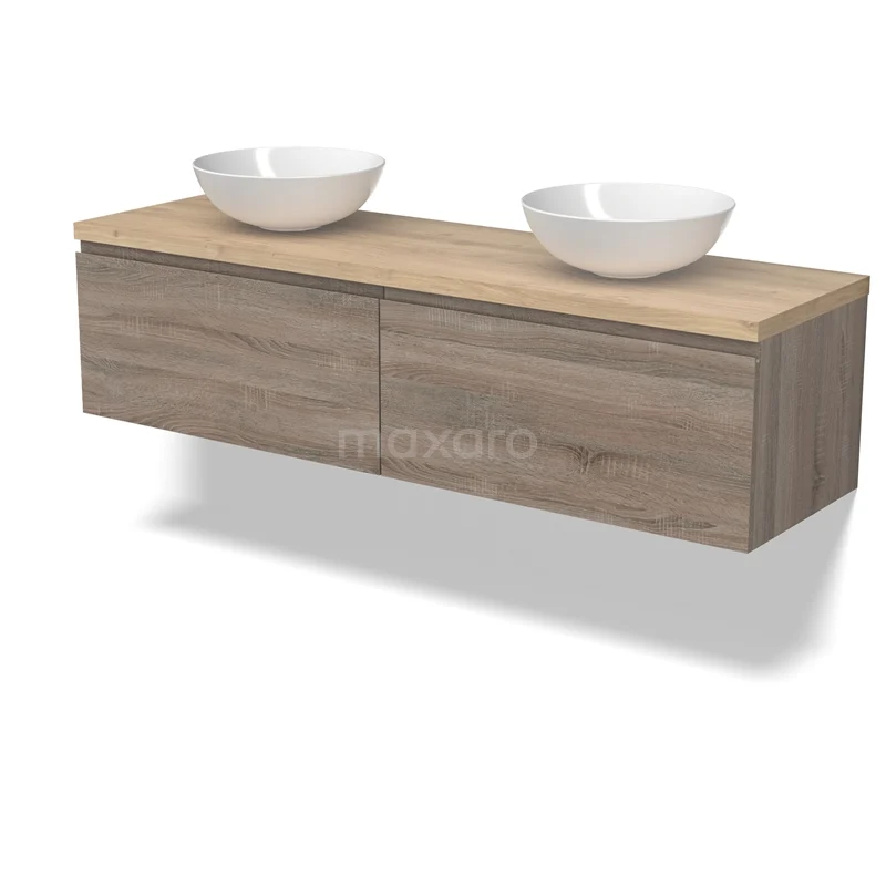 Modulo Plato Badmöbel mit Aufsatzwaschbecken | 160 cm Eiche Grifflos front Hellbraune Eiche blatt 2 nebeneinanderliegende Schubladen