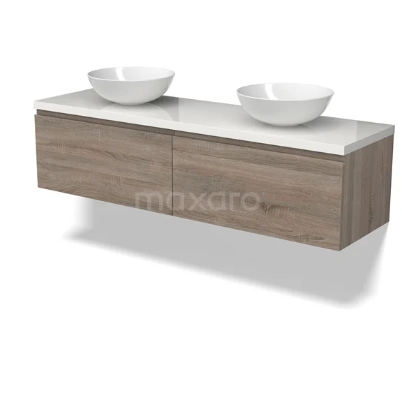 Modulo Plato Badmöbel mit Aufsatzwaschbecken | 160 cm Eiche Grifflos front Hochglanz Weiß blatt 2 nebeneinanderliegende Schubladen BMK12-01821