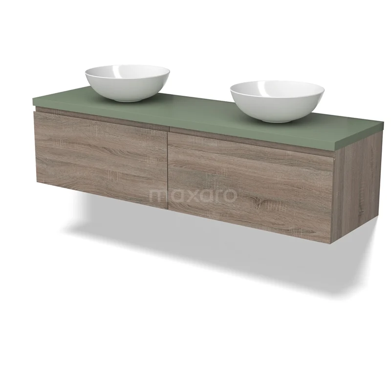 Modulo Plato Badmöbel mit Aufsatzwaschbecken | 160 cm Eiche Grifflos front Salbeigrün blatt 2 nebeneinanderliegende Schubladen