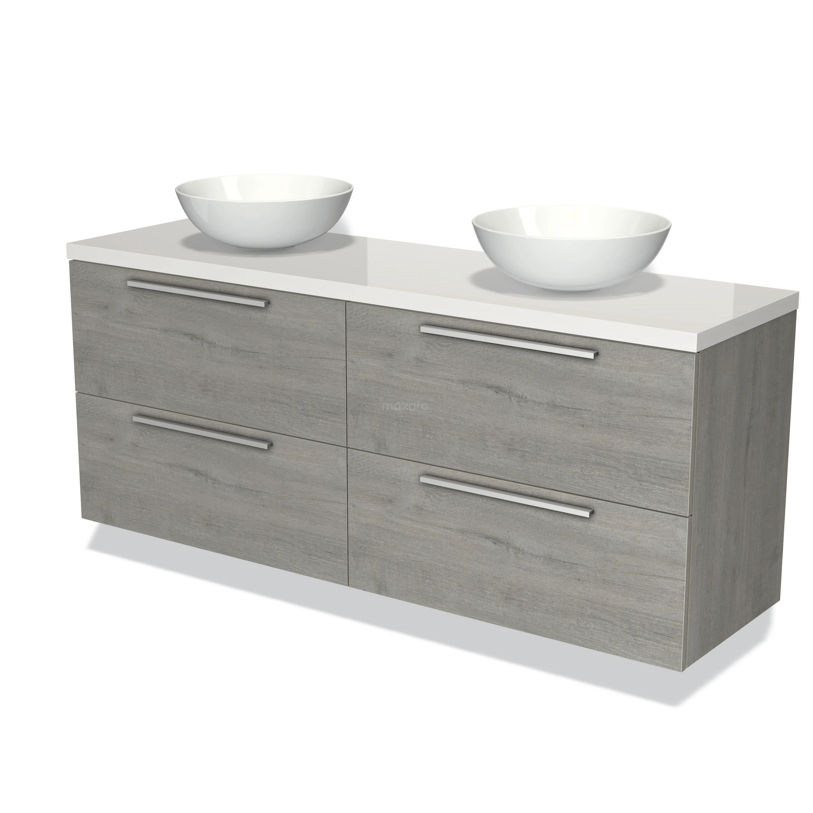 Modulo Plato Badmöbel mit Aufsatzwaschbecken | 160 cm Graue Eiche Flach front Hochglanz Weiß blatt 4 Schubladen