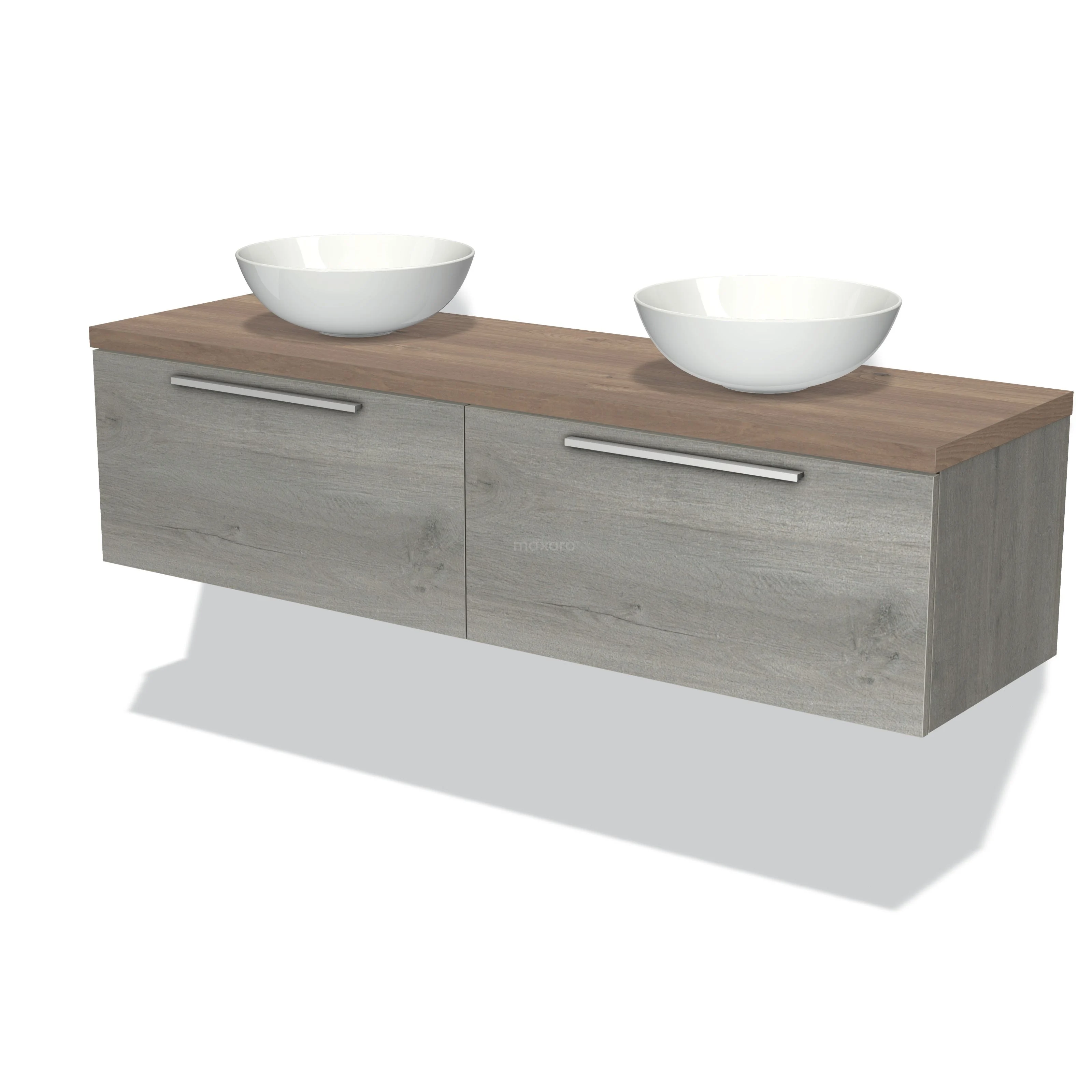 Modulo Plato Badmöbel mit Aufsatzwaschbecken | 160 cm Graue Eiche Flach front Mittelbraune Eiche blatt 2 nebeneinanderliegende Schubladen