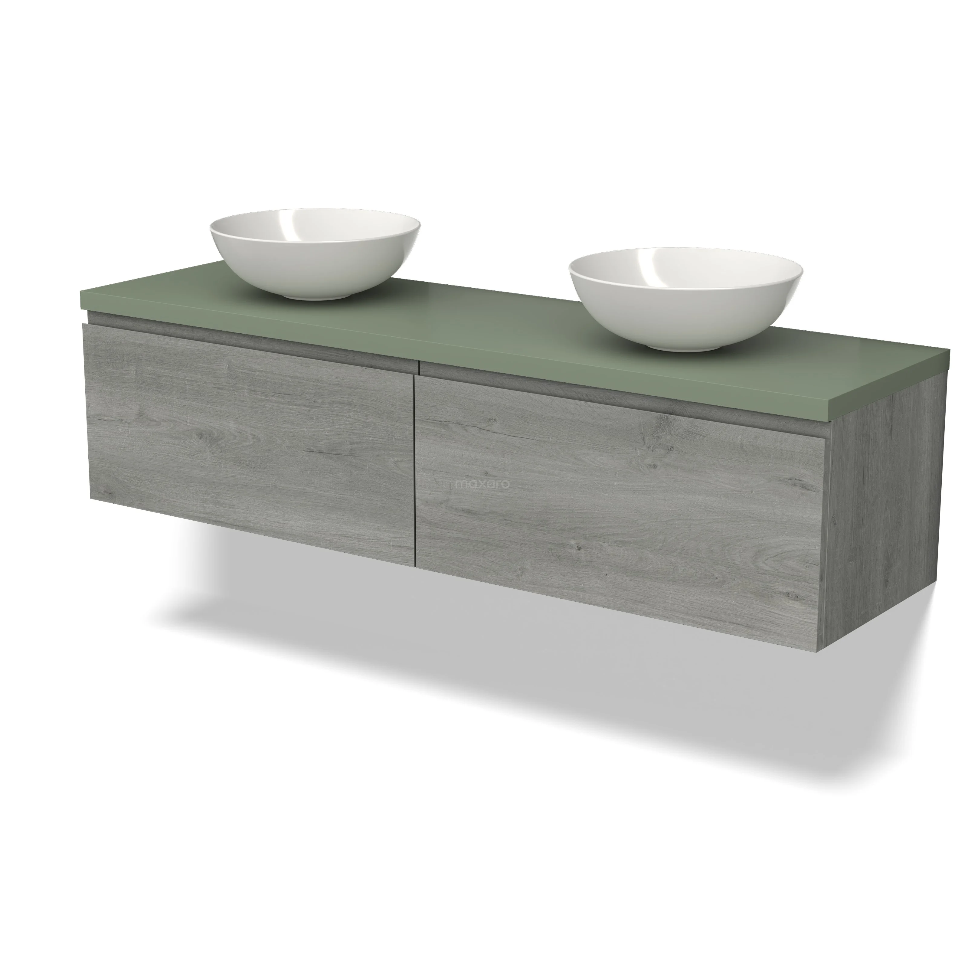 Modulo Plato Badmöbel mit Aufsatzwaschbecken | 160 cm Graue Eiche Rahmen front Salbeigrün blatt 2 nebeneinanderliegende Schubladen