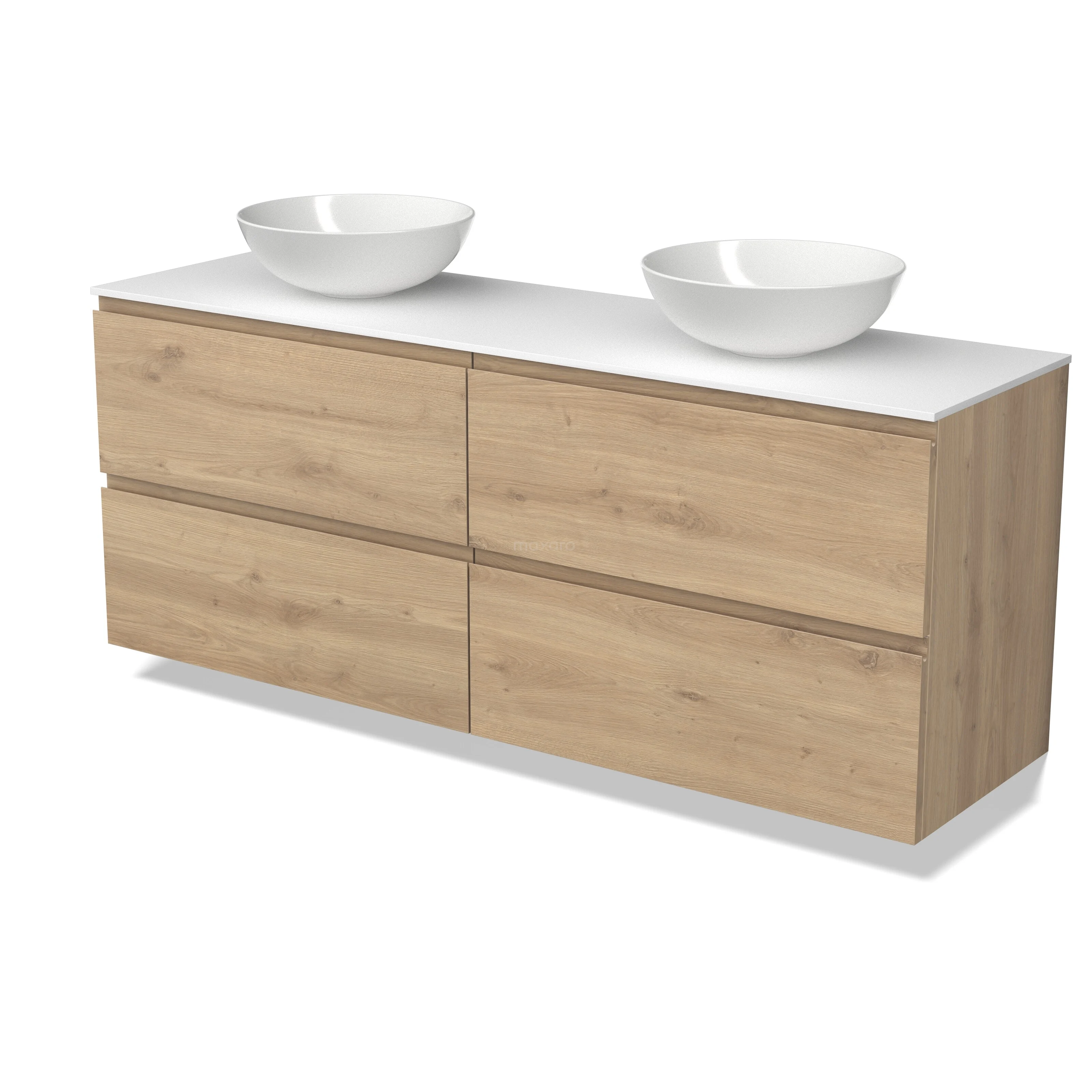 Modulo Plato Badmöbel mit Aufsatzwaschbecken | 160 cm Hellbraune Eiche Grifflos front Solid Surface blatt 4 Schubladen