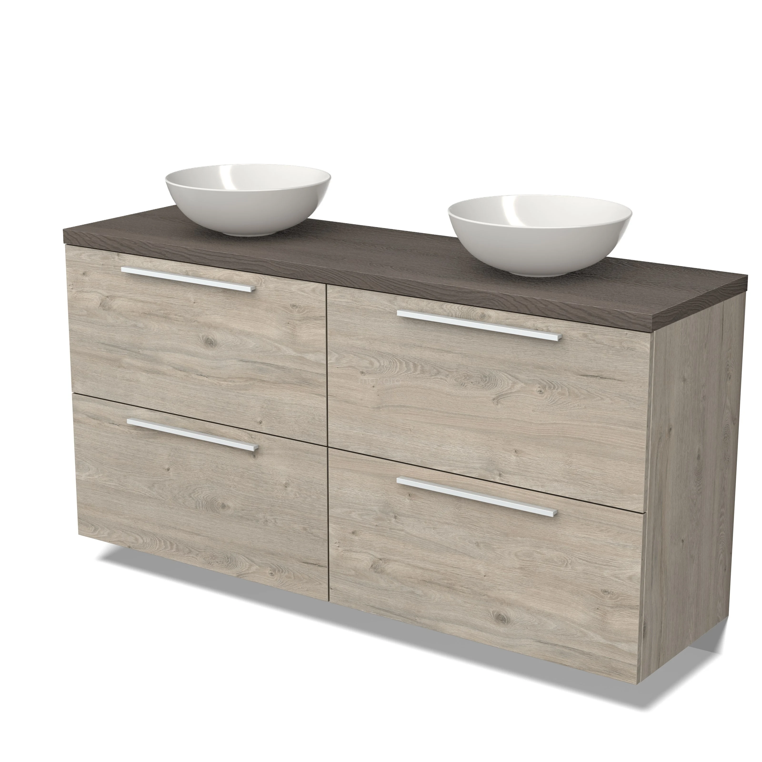 Modulo Plato Badmöbel mit Aufsatzwaschbecken | 160 cm Hellgraue Eiche Flach front Dunkelbraune Eiche blatt 4 hohe Schubladen