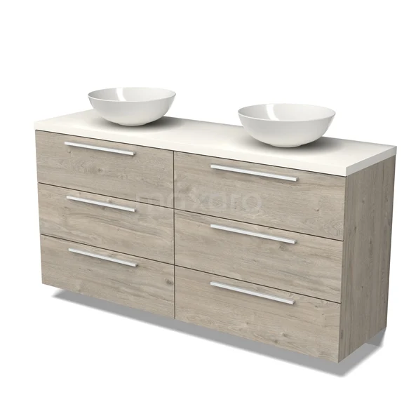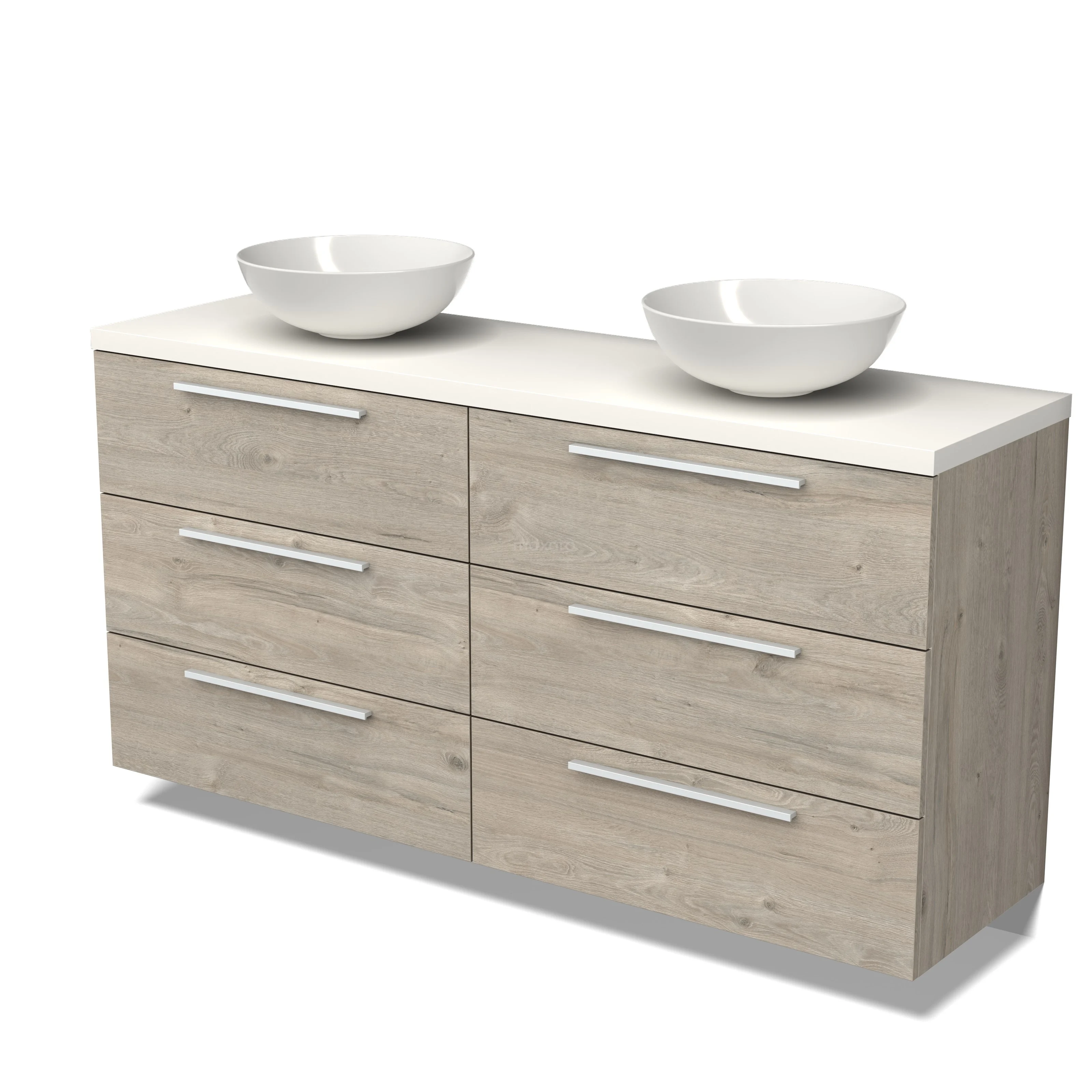 Modulo Plato Badmöbel mit Aufsatzwaschbecken | 160 cm Hellgraue Eiche Flach front Matt Weiß blatt 6 Schubladen