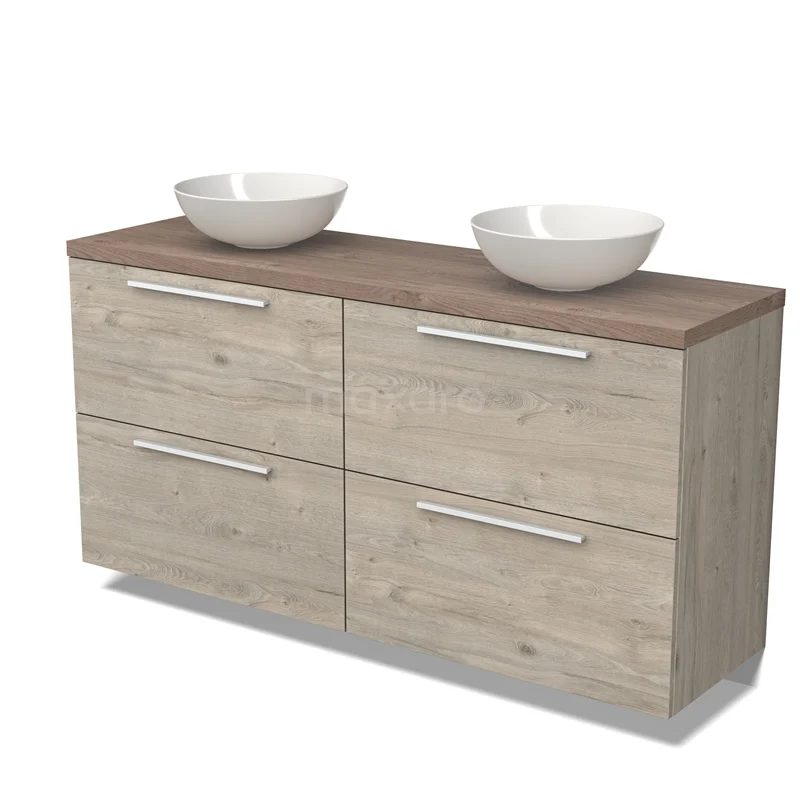 Modulo Plato Badmöbel mit Aufsatzwaschbecken | 160 cm Hellgraue Eiche Flach front Mittelbraune Eiche blatt 4 hohe Schubladen