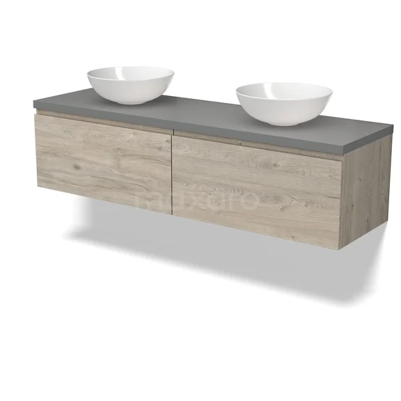 Modulo Plato Badmöbel mit Aufsatzwaschbecken | 160 cm Hellgraue Eiche Grifflos front Dunkelgrau blatt 2 nebeneinanderliegende Schubladen