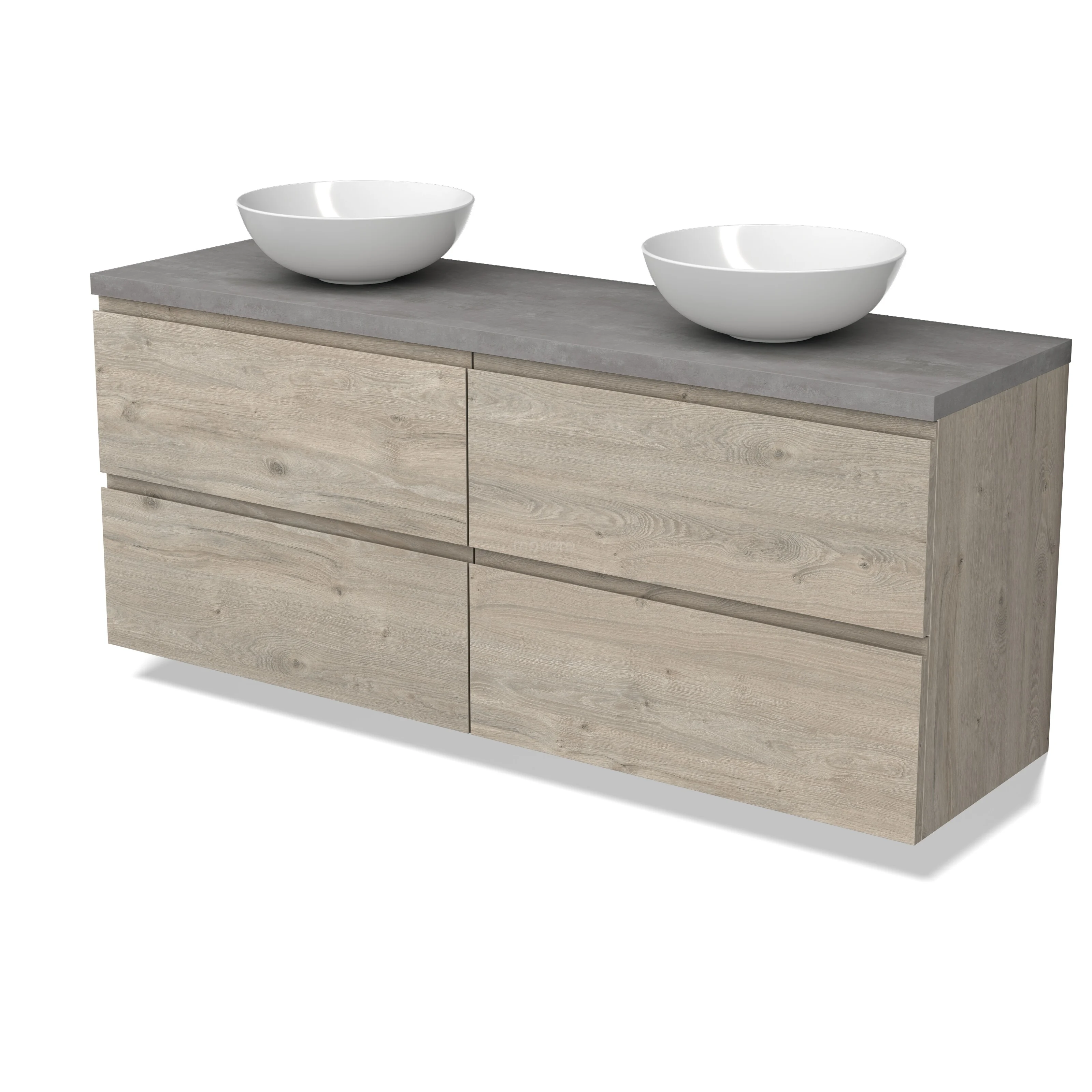 Modulo Plato Badmöbel mit Aufsatzwaschbecken | 160 cm Hellgraue Eiche Grifflos front Hellgrauer Beton blatt 4 Schubladen