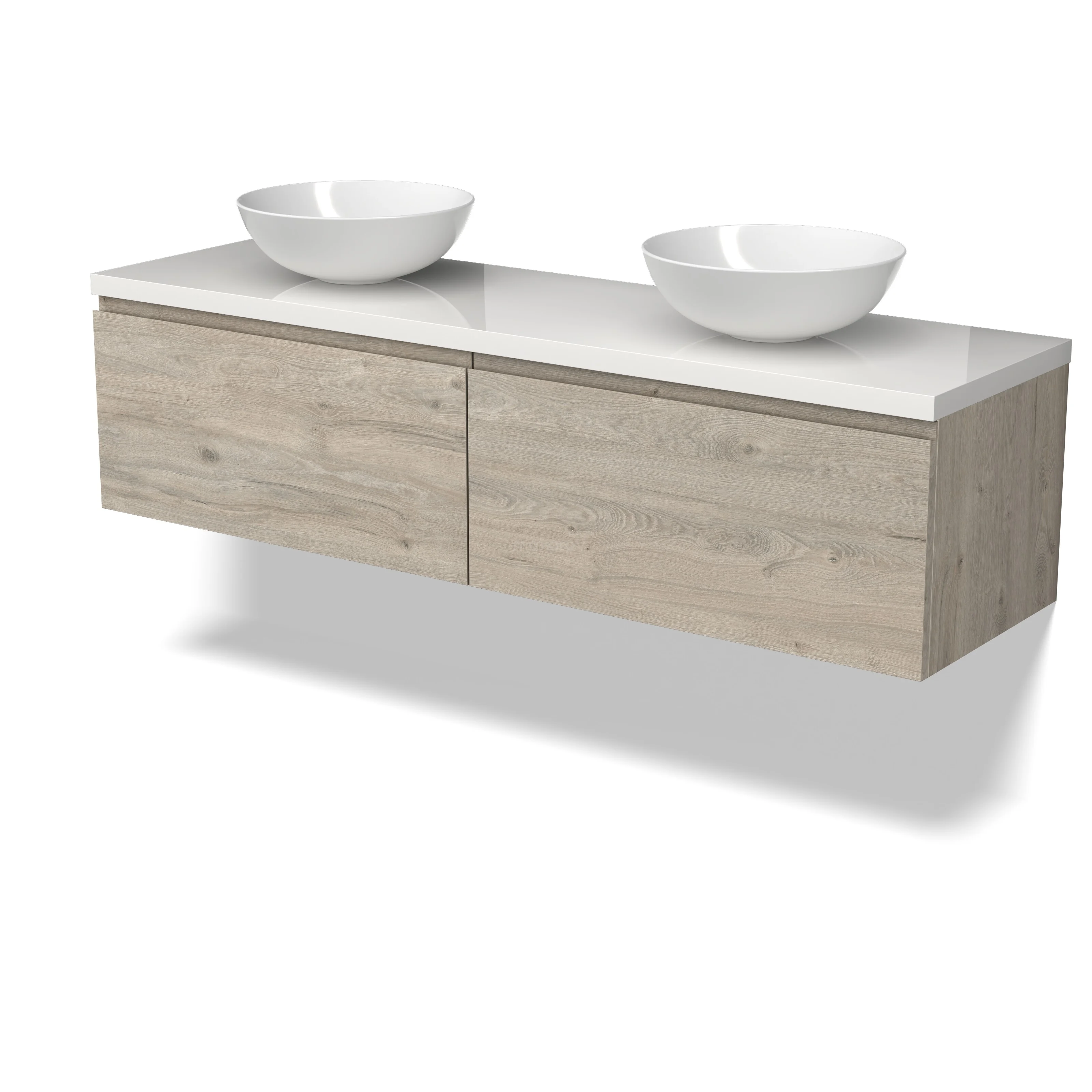 Modulo Plato Badmöbel mit Aufsatzwaschbecken | 160 cm Hellgraue Eiche Grifflos front Hochglanz Weiß blatt 2 nebeneinanderliegende Schubladen