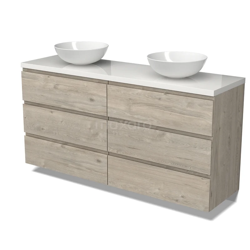 Modulo Plato Badmöbel mit Aufsatzwaschbecken | 160 cm Hellgraue Eiche Grifflos front Hochglanz Weiß blatt 6 Schubladen