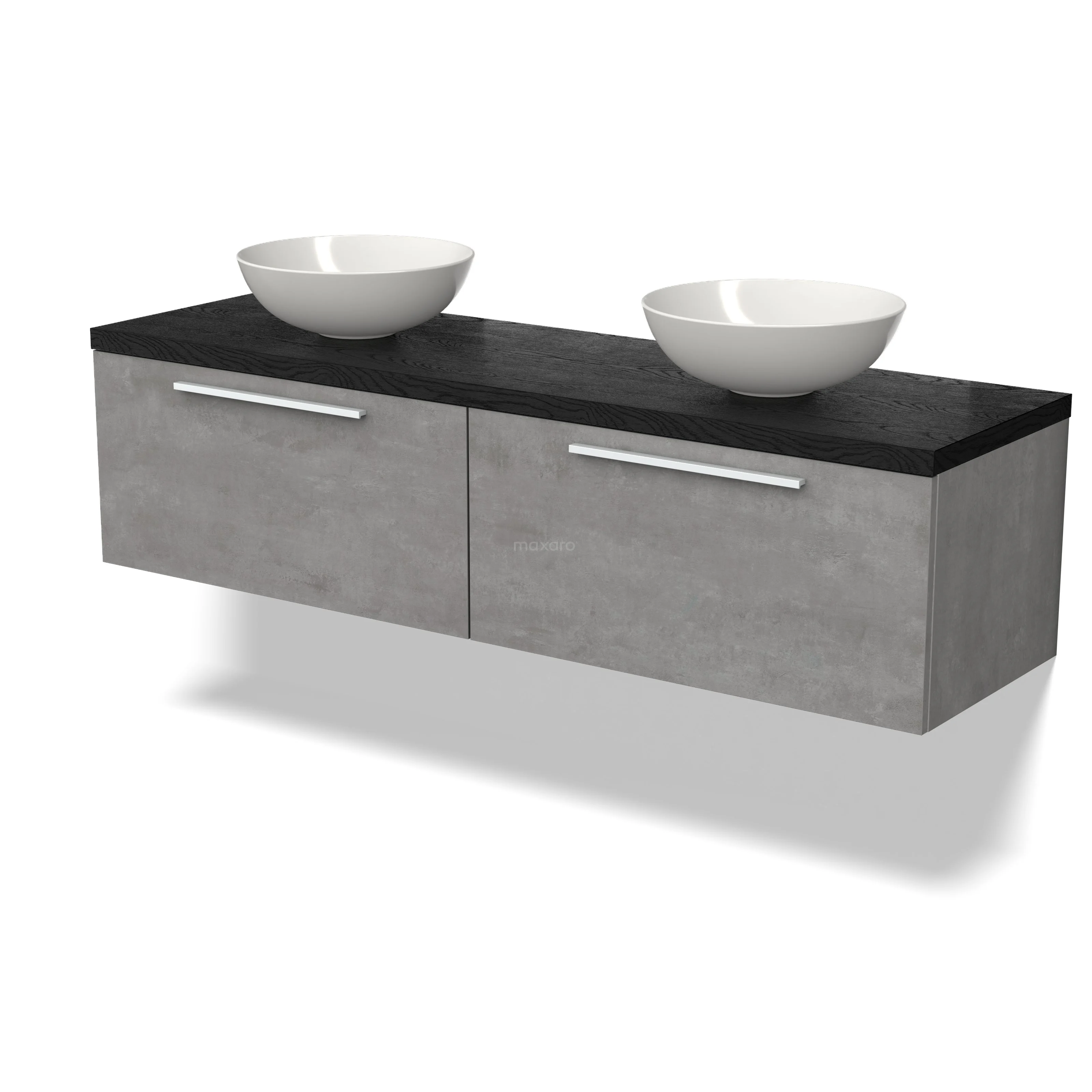 Modulo Plato Badmöbel mit Aufsatzwaschbecken | 160 cm Hellgrauer Beton Flach front Schwarze Eiche blatt 2 nebeneinanderliegende Schubladen
