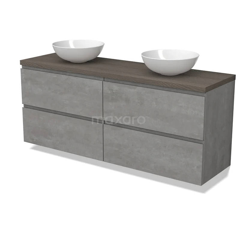 Modulo Plato Badmöbel mit Aufsatzwaschbecken | 160 cm Hellgrauer Beton Grifflos front Dunkelbraune Eiche blatt 4 Schubladen