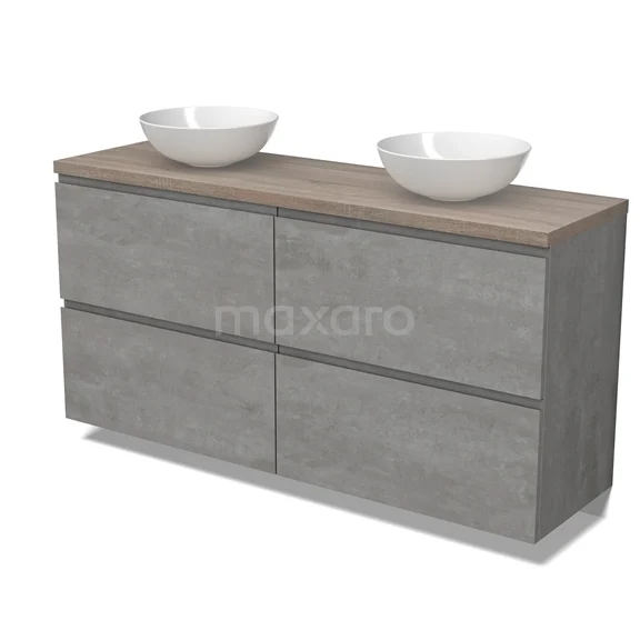 Modulo Plato Badmöbel mit Aufsatzwaschbecken | 160 cm Hellgrauer Beton Grifflos front Eiche blatt 4 hohe Schubladen