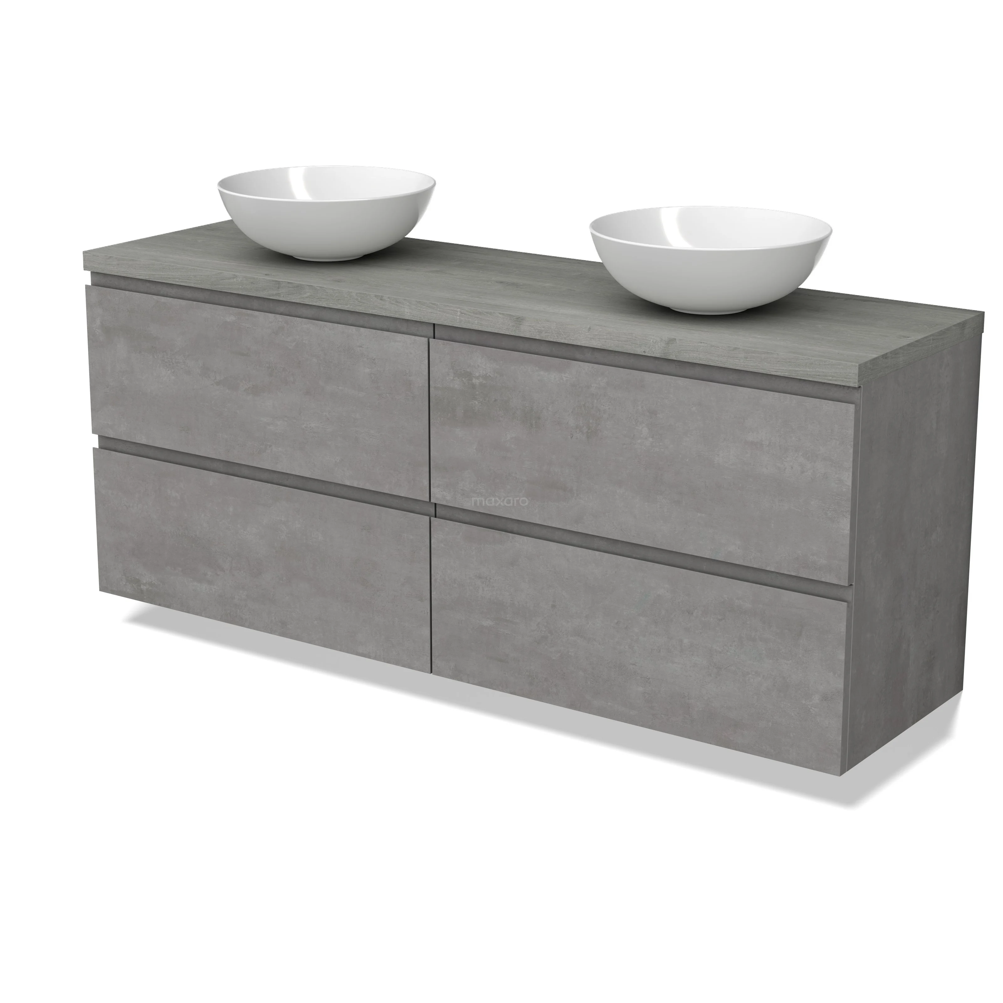 Modulo Plato Badmöbel mit Aufsatzwaschbecken | 160 cm Hellgrauer Beton Grifflos front Graue Eiche blatt 4 Schubladen
