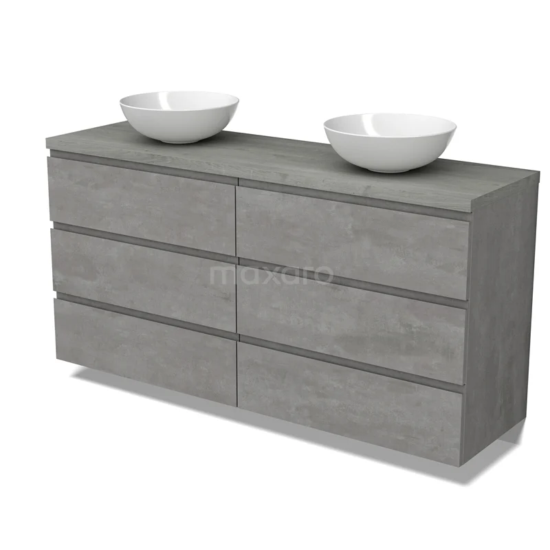 Modulo Plato Badmöbel mit Aufsatzwaschbecken | 160 cm Hellgrauer Beton Grifflos front Graue Eiche blatt 6 Schubladen