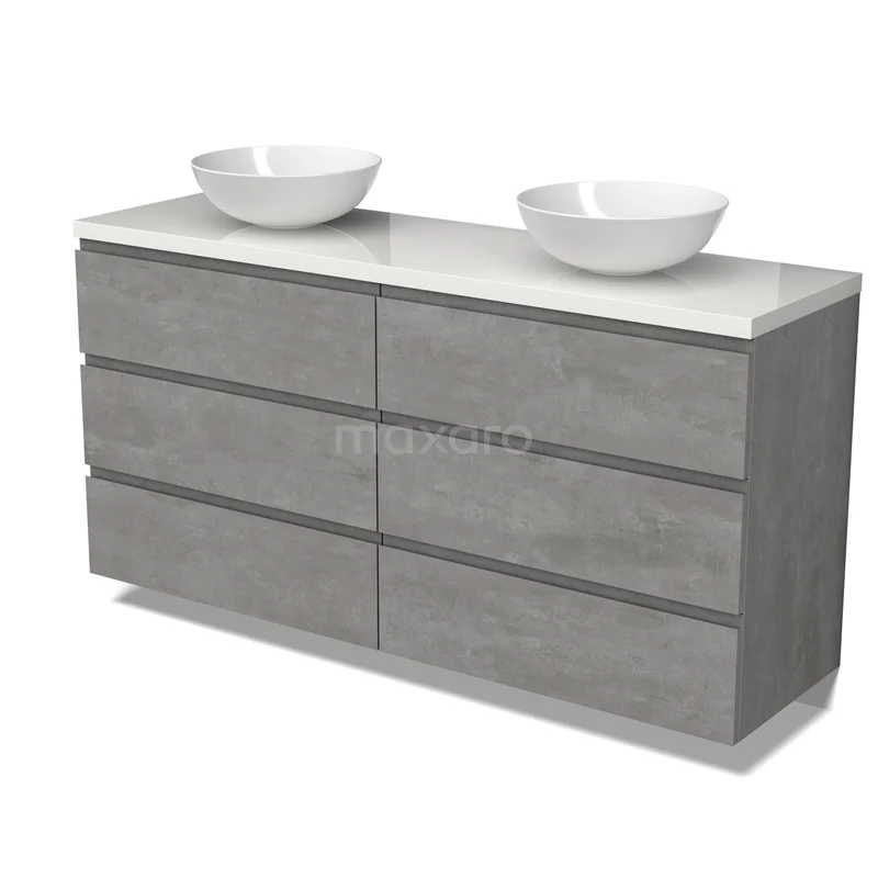 Modulo Plato Badmöbel mit Aufsatzwaschbecken | 160 cm Hellgrauer Beton Grifflos front Hochglanz Weiß blatt 6 Schubladen